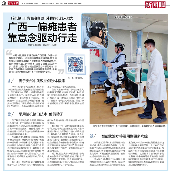 近日,广西云-广西日报、南国早报等媒体报道广西医科大学第一附属医院成功完成“脊髓电刺激手术联合脑机接口与外骨骼机器人”的神经功能重建治疗。