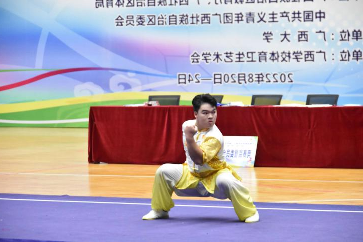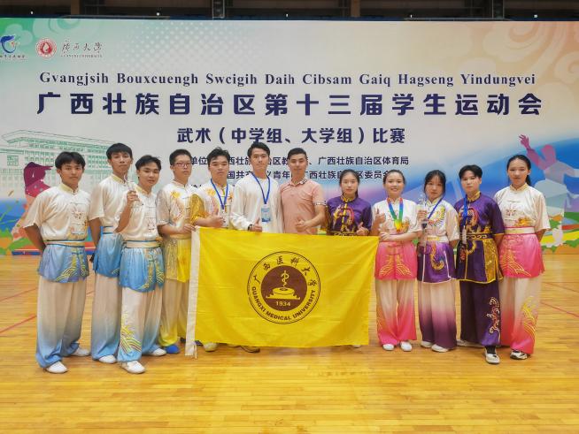 为发挥体医融合重要作用,协同多学科人才培养德智体美劳全面发展的需求,我校选派广西医科大学武术队10名队员,由张珀滔、实习老师王川担任教练员参加由广西壮族自治区教育厅、自治区体育局、共青团广西区委联合主办、广西大学承办、广西学校体育卫生艺术学会协办的广西壮族自治区第十三届学生运动会武术(中学组、大学组)比赛,8月20-24日在广西大学综合体育馆拉开战幕。本次比赛共有56支队伍,375名运动员,经过5天的激烈角逐,广西医科大学武术队不负众望,在多个单项中荣获多项冠军。