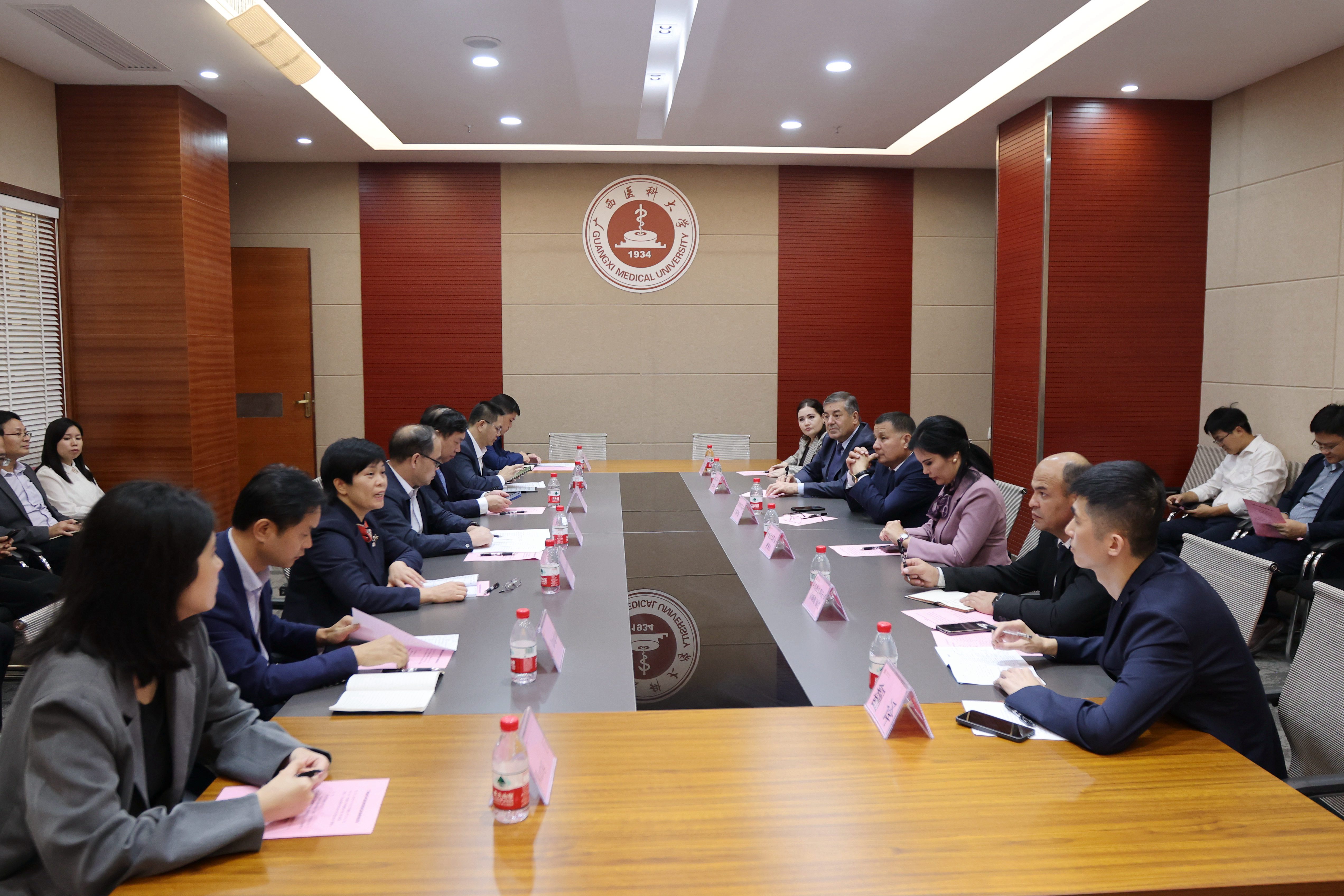 座谈会上,陈俊强副校长代表学校对代表团一行到来表示热烈的欢迎,并介绍了我校的办学历史、办学方向和特色、科学研究、国际医学教育及对外合作交流情况等,希望通过此次座谈会的契机,增进双方了解,建立友好关系,今后在学术交流、医疗教育等领域开启合作。随后,与会的广西高校分别介绍了各自学校的办学历史、教学科研等情况,乌方三所高校也分别介绍了学校的建校历史、办学特色、专业优势等,表达了希望与广西高校开展可能性合作的意愿。其中,塔什干医学院乌尔根奇分院院长表示希望通过此次来访,与广西的医科院校建立联系,开展师生交流、联合办学项目等合作。