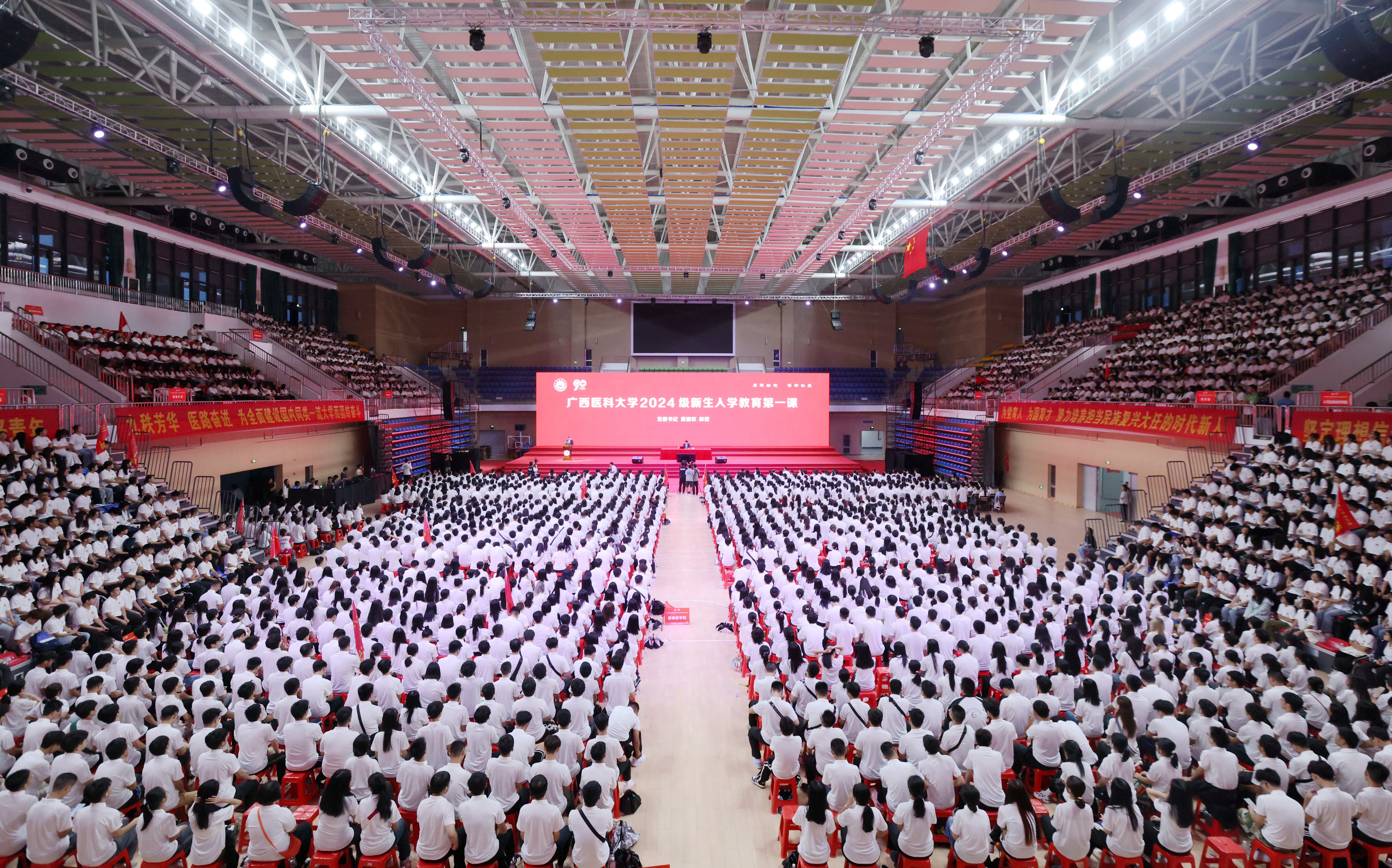 为深入学习贯彻习近平新时代中国特色社会主义思想和党的二十届三中全会精神,引导新生坚定理想信念,汇聚青春力量,9月9日晚,学校党委黄照权书记以《传承荣光奋进追梦 争做新时代医大人》为题,为2024级新生讲授入学教育第一课,授课通过线上线下相结合的方式,在武鸣校区设面对面主会场,南宁-校本部和玉林校区线上“云端”相会,陈俊强副校长主持入学教育第一课。