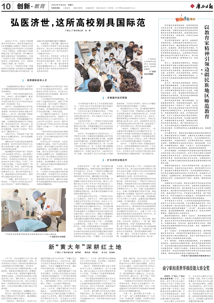2024年11月6日,《广西日报》在第10版创新·教育专栏发表题为《弘医济世,这所高校别具国际范》的通讯报道,回顾和展现了我校建校90年来在培养国际医学人才、开展援外医疗服务及对外交流合作等方面的工作成果。敬请关注!
