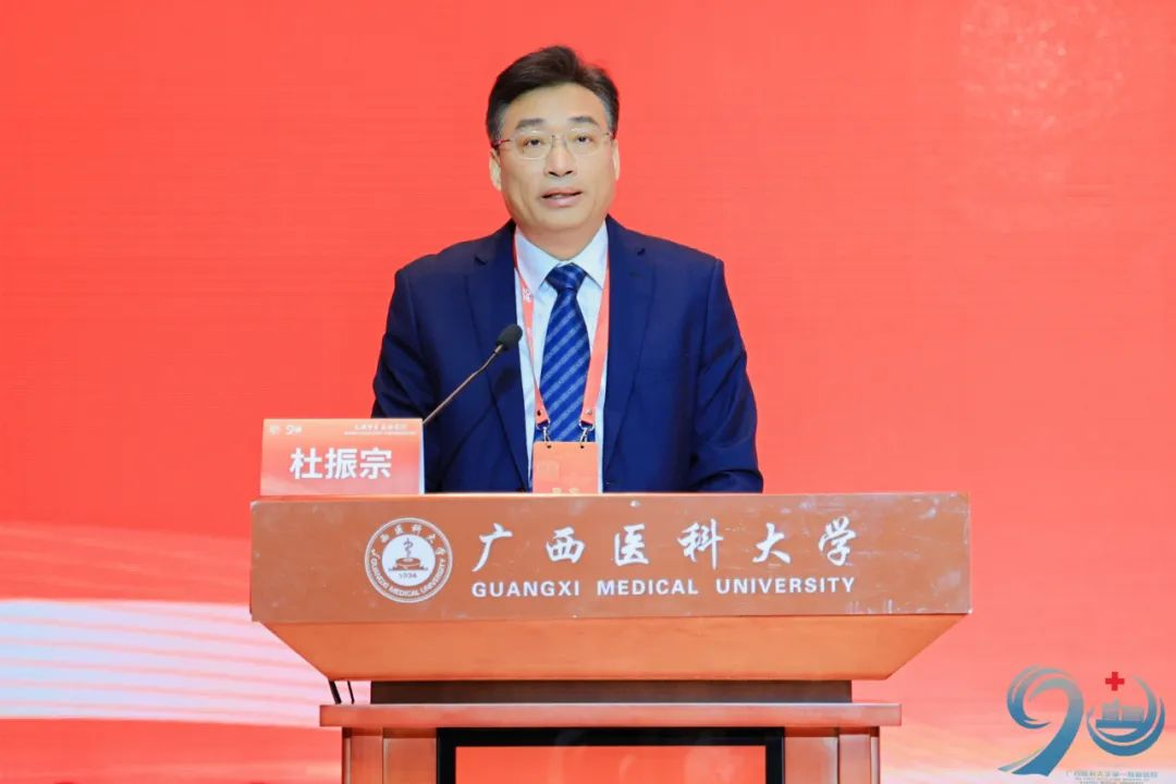 杜振宗充分肯定广西医科大学第一附属医院建院90年来医教研管各项事业取得的成绩。他指出,新征程上,广西医科大学第一附属医院要积极对接“健康广西”建设重大需求,进一步优化医院发展规划、学科建设、人才结构、诊疗和运营管理模式,继续当好广西公立医院改革创新的“排头兵”、高质量发展的“领跑者”、人民群众健康的“守护者”,为群众提供更优质、更安全、更高效的医疗服务;要继续勇于担当、主动作为,充分发挥示范引领作用,贯彻新时代党的卫生与健康工作方针,推动优质医疗资源扩容下沉和均衡布局,带动提升区域医疗服务水平,助力完善医疗卫生服务体系,促进全区医疗卫生事业发展跃升新台阶;要以建院90周年为新起点,深刻把握新形势下大型公立医院的功能定位,完整、准确、全面贯彻新发展理念,深化以公益性为导向的公立医院改革,强化内部管理,更加突出内涵建设,促进医院良性运行和可持续高质量发展。