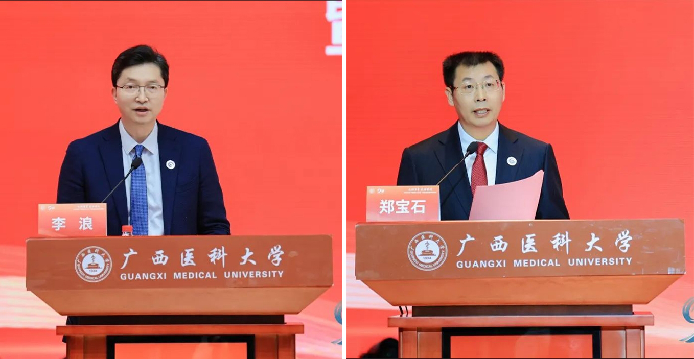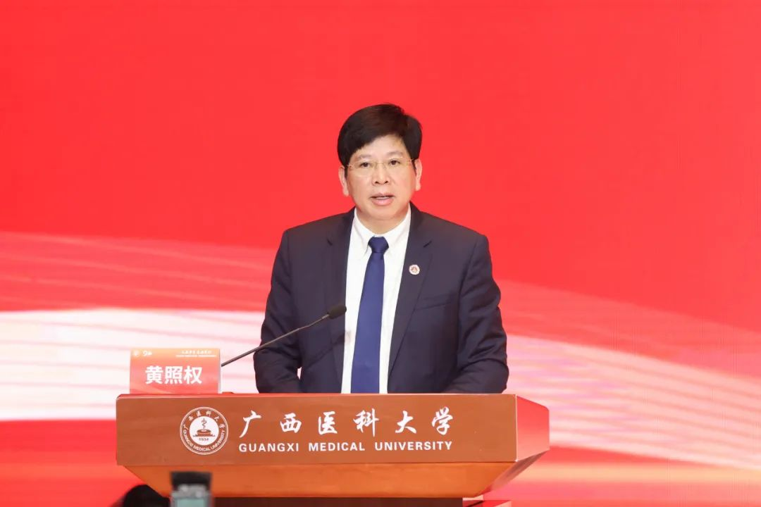 广西医科大学第一附属医院院长郑宝石致辞,他从学科建设、医学教育、人才队伍、科研创新、国际合作、医院高质量发展等方面全面深情回顾了医院90年来踔厉奋发的发展历程。展望未来,他表示,医院将以建设“国家地中海贫血临床医学研究中心和国家重症区域医疗中心”双国家级中心为抓手,坚定朝着建成“国内一流、国际著名医科大学附属医院和国家区域医疗中心”的宏伟目标迈进;持续优化医疗服务、深入推进医疗体制改革、强化医教研创新驱动发展、创新人才培养模式、建设高效协同医疗体系,为护佑人民生命健康贡献更多的智慧与力量。