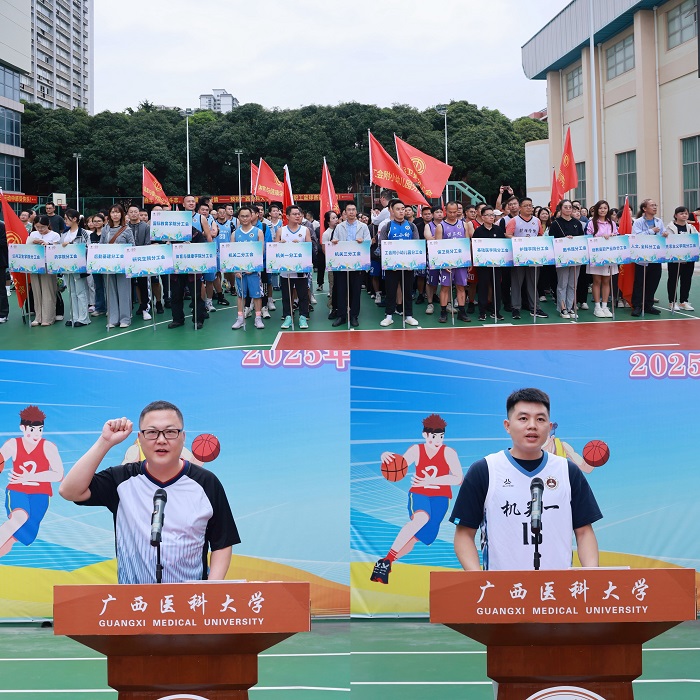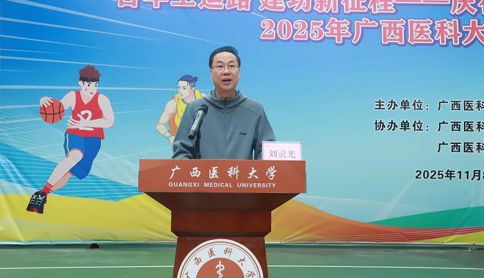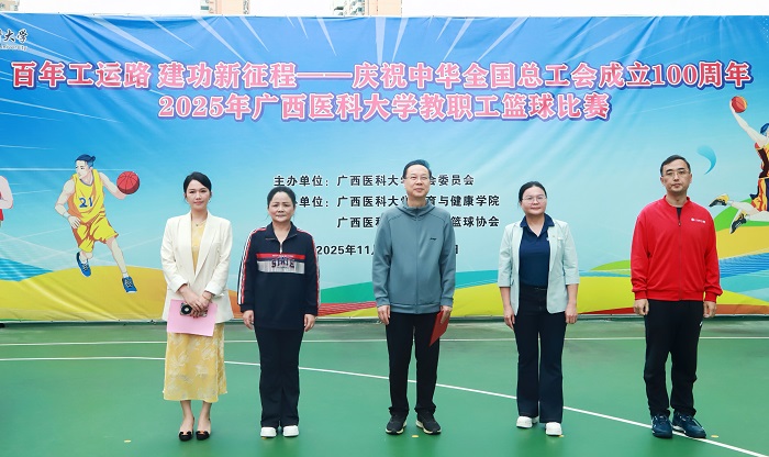 11月8日,“百年工运路 建功新征程——庆祝中华全国总工会成立100周年”2025年广西医科大学教职工篮球比赛在校本部篮球场顺利开赛。本次篮球赛由校工会主办,体育与健康学院、教职工篮球协会协办,学校党委副书记、工会主席刘灵光出席开幕式并发表致辞。