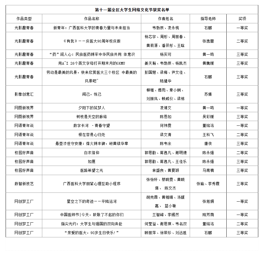 近日,自治区教育厅印发了《关于公布第十一届全区大学生网络文化节和全区高校网络教育优秀作品展示大赛获奖名单的通知》,我校师生凭借扎实创作功底与鲜明作品特色再创佳绩,共25项作品获奖,其中一等奖7项、二等奖7项、三等奖11项。