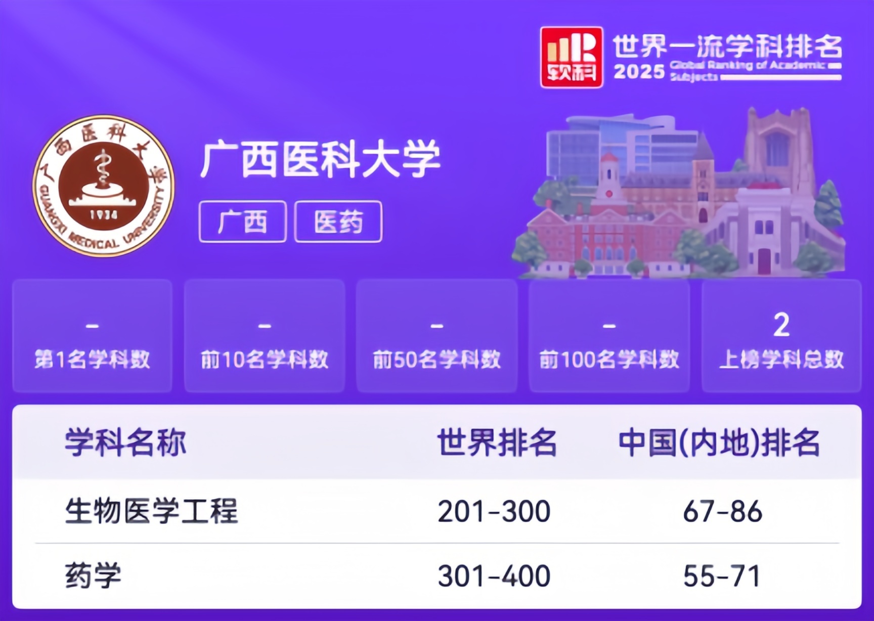 日前,高等教育评价专业机构软科正式发布2025“软科世界一流学科排名”,广西医科大学生物医学工程学科、药学学科连续两年上榜,分别位列世界排名201-300名区间、301-400区间。2025“软科世界一流学科排名”新增人工智能、机器人科学与工程两个学科,排名学科总数达到57个,覆盖理学、工学、生命科学、医学和社会科学五大领域,涵盖全球3000多所大学。广西医科大学共有2个学科跻身榜单,其中生物医学工程学科已连续两年稳居世界前300强,充分体现了该学科在科学研究、人才培养、交流合作等方面的综合实力与国际影响力。同时,药学学科也连续两年上榜,这一成绩彰显了该学科在药物研发、临床药学服务等领域的发展成效,二者共同成为学校学科建设水平稳步提升的有力见证。