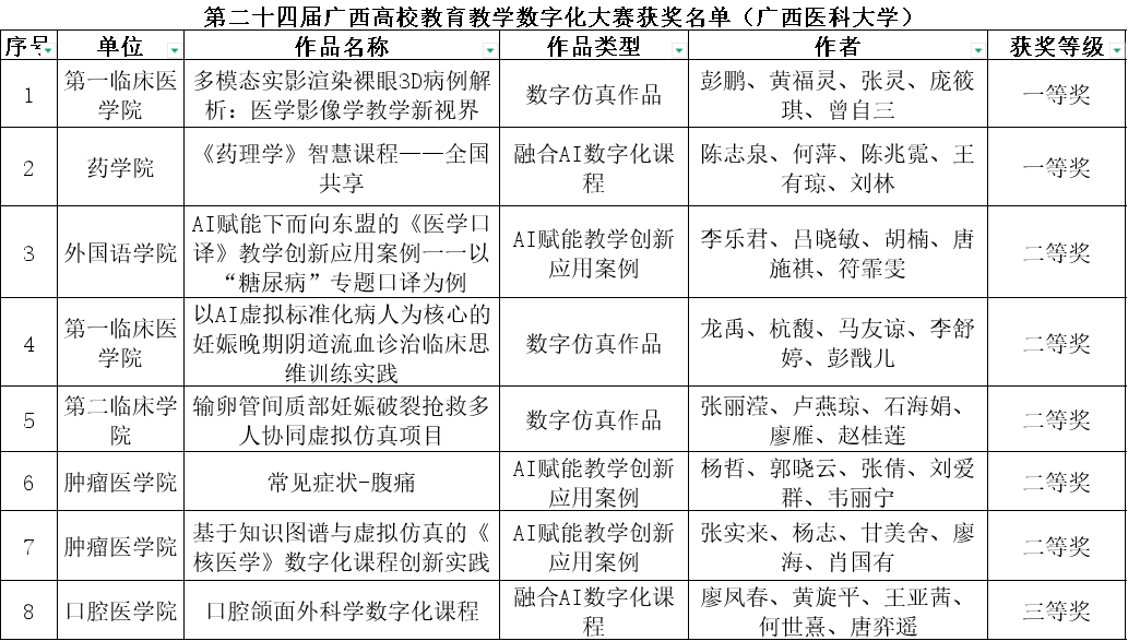 近日,自治区教育厅公布了第二十四届广西高校教育教学数字化大赛获奖名单(桂教教师〔2025〕95号),我校荣获一等奖2项,二等奖5项,三等奖1项。其中,第一临床医学院彭鹏、药学院陈志泉获一等奖。