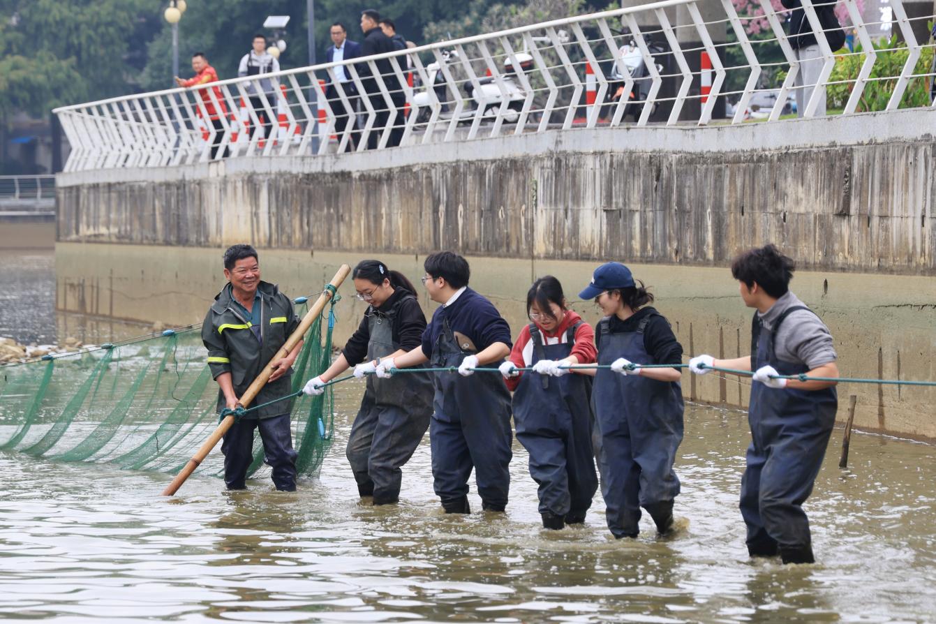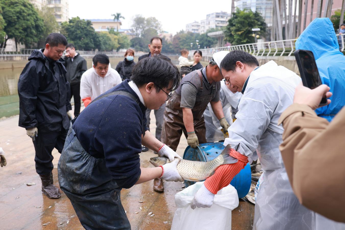 12月29日上午,一年一度的杏湖冬捕活动在广西医科大学南宁—校本部杏湖拉开序幕。学校校长曾志羽、副校长唐卫中、师生代表及离退休教职工齐聚湖畔,共同见证丰收场景。在专业人员的指导下,十余名学生参与了拉网、收鱼等捕捞环节。活动共捕捞“幸福鱼”(杏湖鱼)近8000斤,品种涵盖罗非鱼、草鱼、白鲢鱼、鲤鱼等。活动同步在南宁市融媒体中心新闻夜班相关账号开展直播,网络直播观看总人次100522人次。