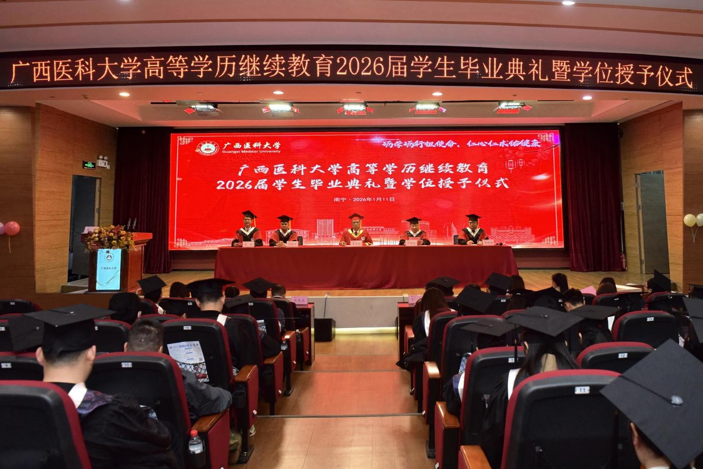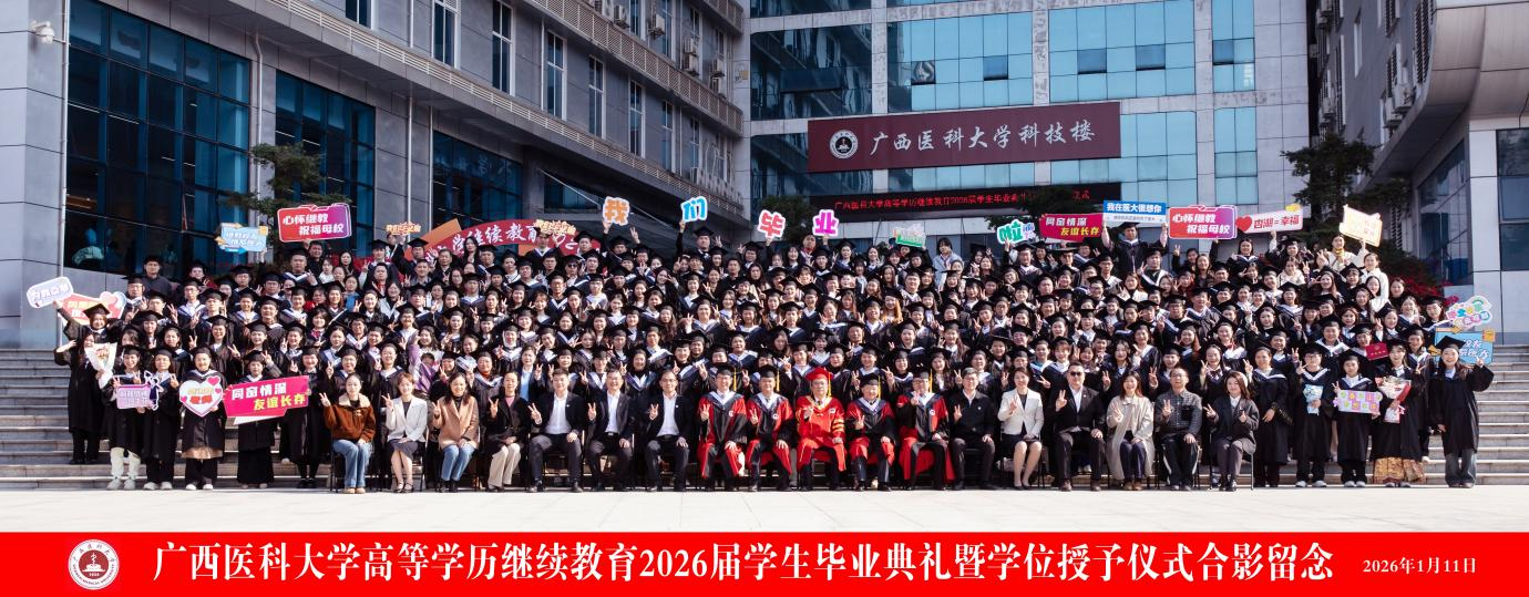 1月11日,广西医科大学2026届高等学历继续教育学生毕业典礼暨学位授予仪式在学校科技楼报告厅举行,各教学点毕业生通过线下与线上方式共赴盛会。广西医科大学校长曾志羽、副校长卢德成出席毕业典礼,教务处、研究生院负责人,校本部和各教学点教师代表以及400余名毕业生代表现场参加毕业典礼,各校外教学点的4500余名毕业生云端参加。毕业典礼由继续教育学院院长周波主持。