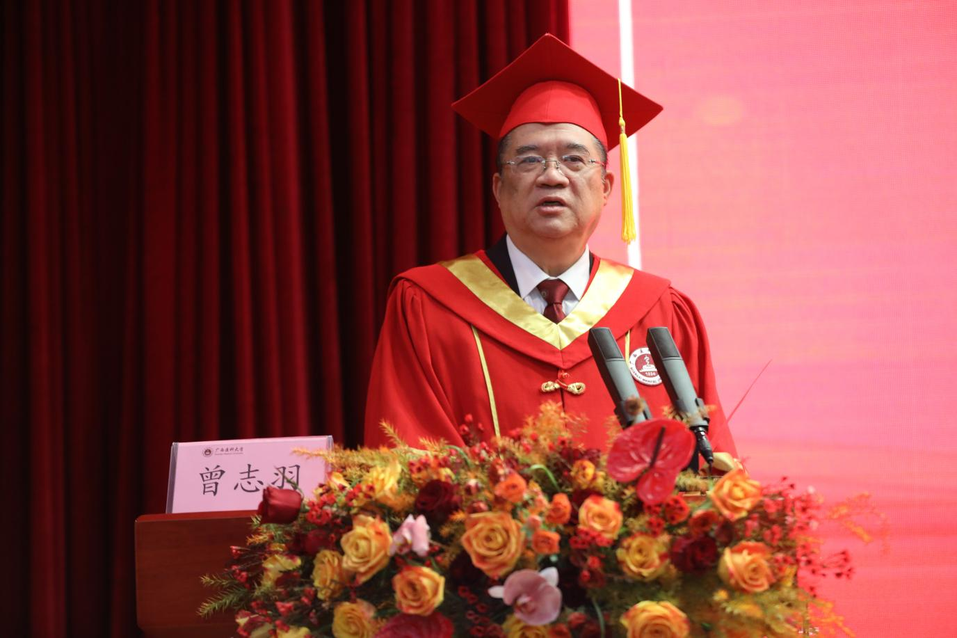 毕业典礼上,曾志羽校长以“砺学砺行担使命,仁心仁术佑健康”为题寄语全体毕业生,他希望毕业生们以“扎根基层”为笔,做健康广西的“筑梦人”;以“终身学习”为帆,做医学创新的“追光者”;以“仁心仁术”为灯,做医德医风的“践行者”。卢德成宣读授予学士学位文件。