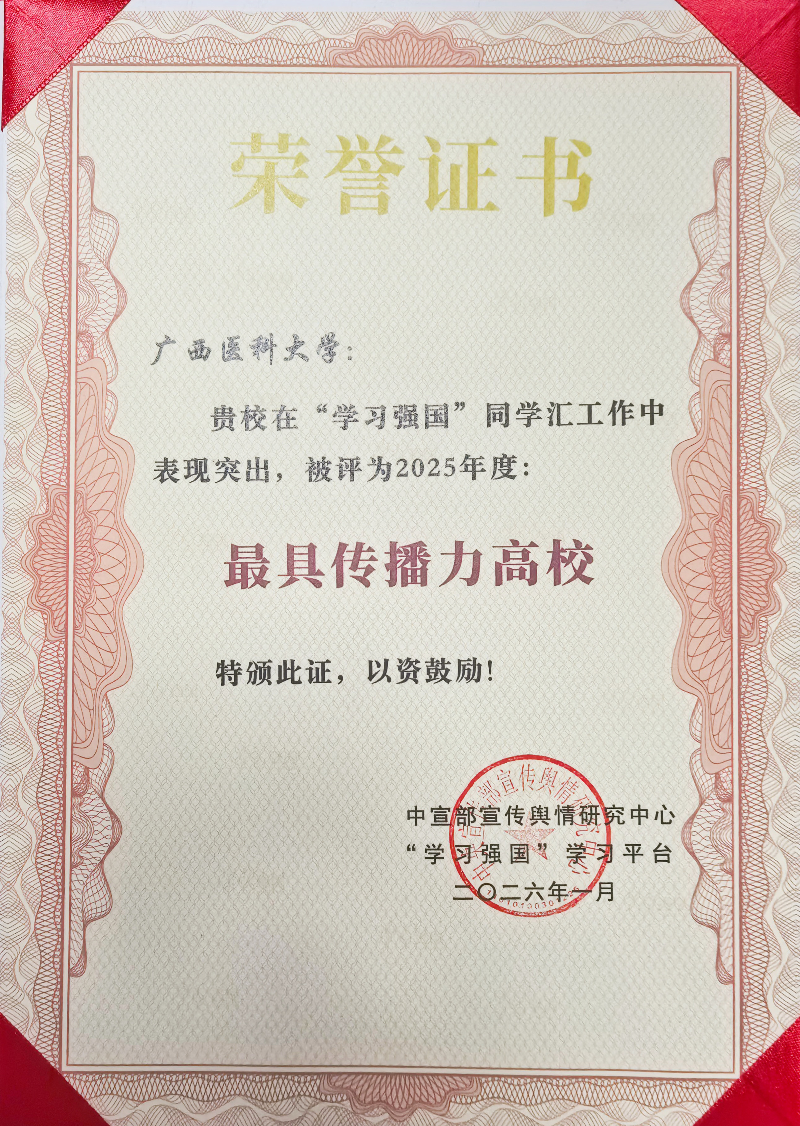 近日,广西医科大学获中宣部宣传舆情研究中心、“学习强国”学习平台授予2025年度“学习强国”同学汇“最具传播力高校”称号。