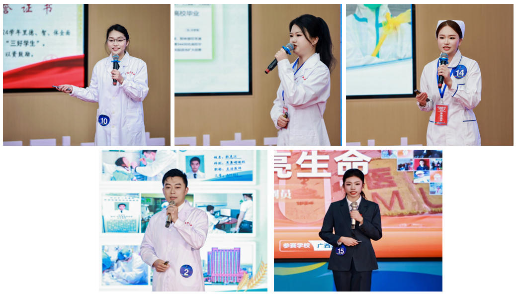 广西赛区现场总决赛在南宁师范大学明秀校区举办。学生赛道五位选手充分展现了广西医科大学学子的专业风采与职业潜力。其中,生命科学与医学工程学院曾芷璇荣获就业赛道本科生组金奖、口腔医学院黄诗涵荣获成长赛道银奖、护理学院陈佳怡荣获就业赛道本科生组银奖;第二临床医学院何真、杜克江荣获就业赛道研究生组银奖;教学赛道中,韦译婷教师发挥出色,以总分第一的成绩斩获金奖。