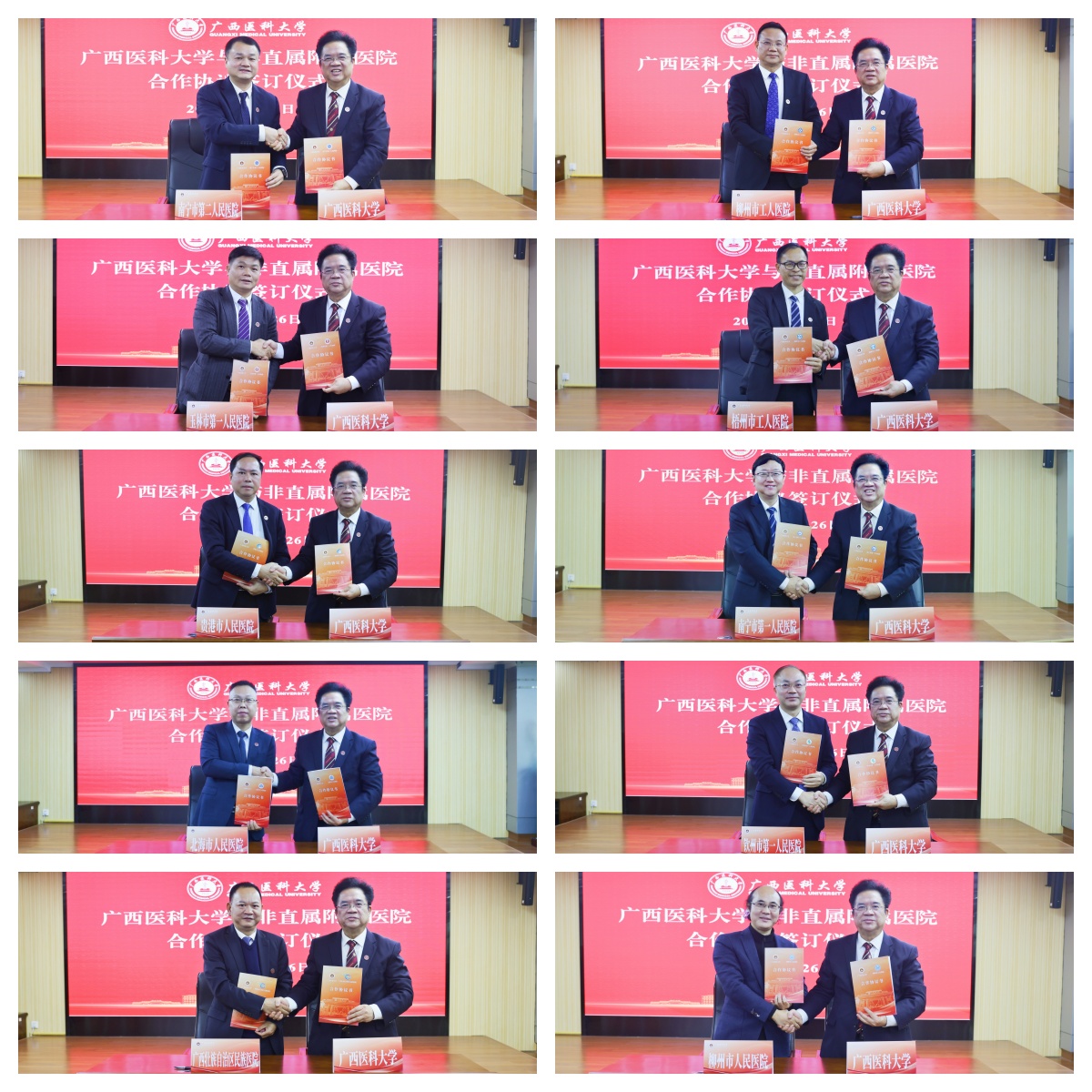 1月26日上午,学校与10家非直属附属医院合作协议签订仪式在校本部综合楼14楼会议室举行。仪式上,校长曾志羽与各家医院主要负责人依次签订《广西医科大学与非直属附属医院合作协议书》并进行座谈交流。仪式由副校长李浪主持。学校相关职能部门负责人齐聚现场,共同见证这一重要时刻。