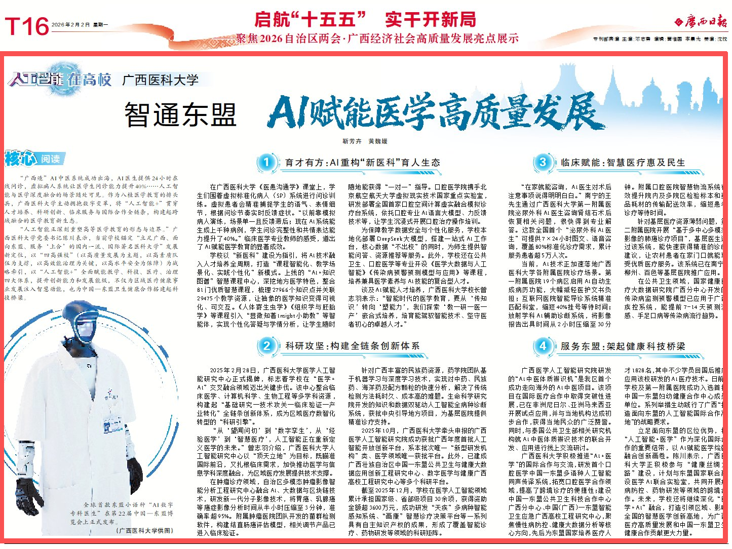 2026年2月2日,《广西日报》报道我校立足面向东盟的区位优势,将“人工智能+医学”作为深化国际合作的重要纽带,主动拥抱数字变革,以“人工智能+”全面赋能人才培养、科研创新、临床服务与国际合作全链条,构建起跨域融合的医学教育新生态。