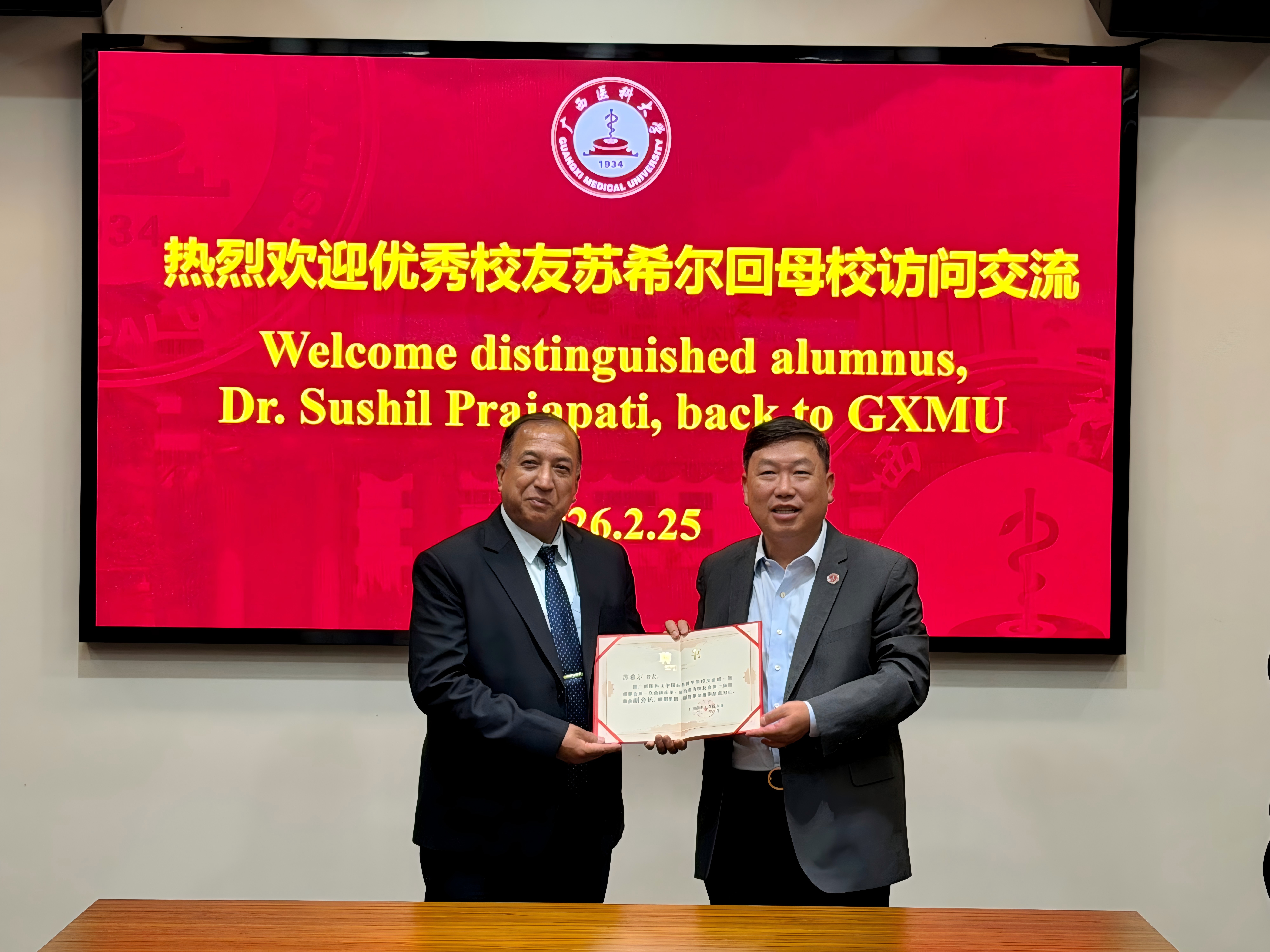 2月25日上午,我校尼泊尔籍优秀校友——尼泊尔国立医学院附属BIR医院消化内科副教授、Arniko Society(简称“协会”)主席苏希尔(Sushil Prajapati)重返母校访问交流。学校副校长陈俊强,国际教育学院、校长办公室、第一附属医院相关负责人及教师代表参加座谈会。