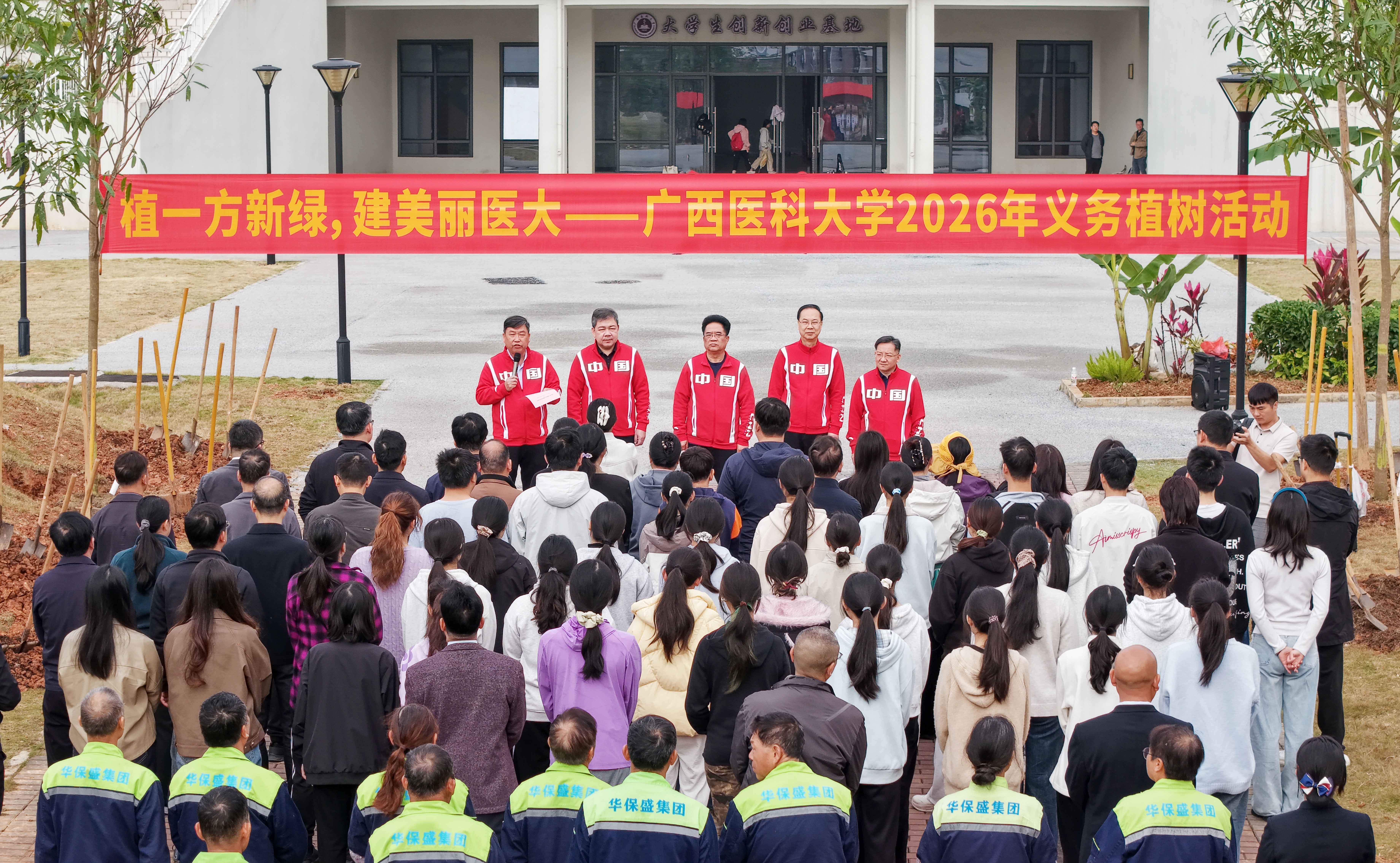 曾志羽回顾了武鸣校区六年多来从阡陌田野到现代化医学校园的建设历程,阐释了“十年树木,百年树人”的深刻内涵。他表示,此次种下的不仅是一株株树苗,更是对生态文明的践行、对生命成长的期许,以及“厚德励志、博学弘医”校训精神的传承。他与师生许下十年之约,期许新苗枝繁叶茂、学子成长为守护健康的栋梁之才。