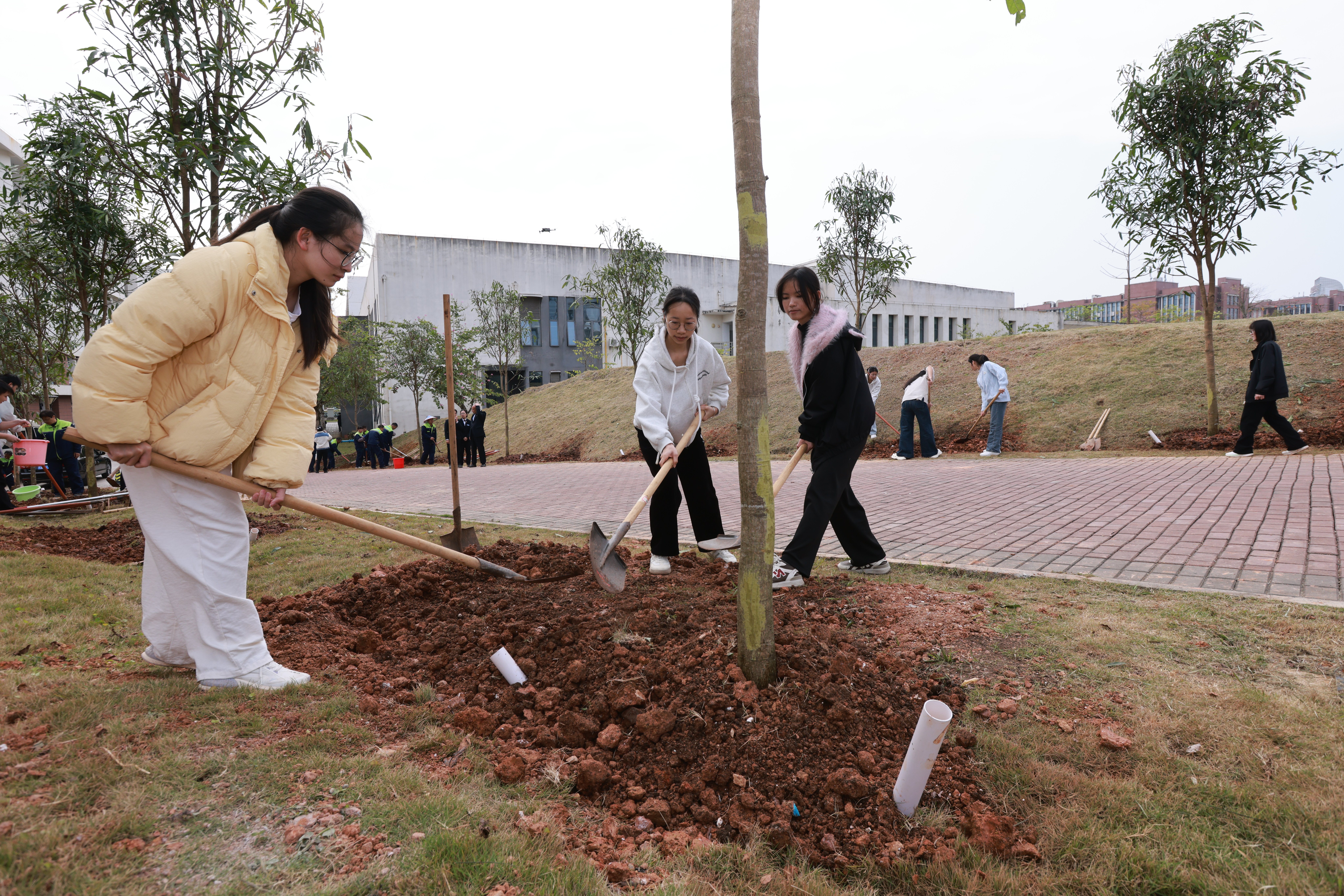 仪式结束后,植树现场一派热火朝天的景象。师生们分工协作,挥锹铲土、扶苗定植、培土浇水,认真完成每一道工序,一株株新栽的扁桃树苗迎风挺立,为春日校园再添盎然生机。
