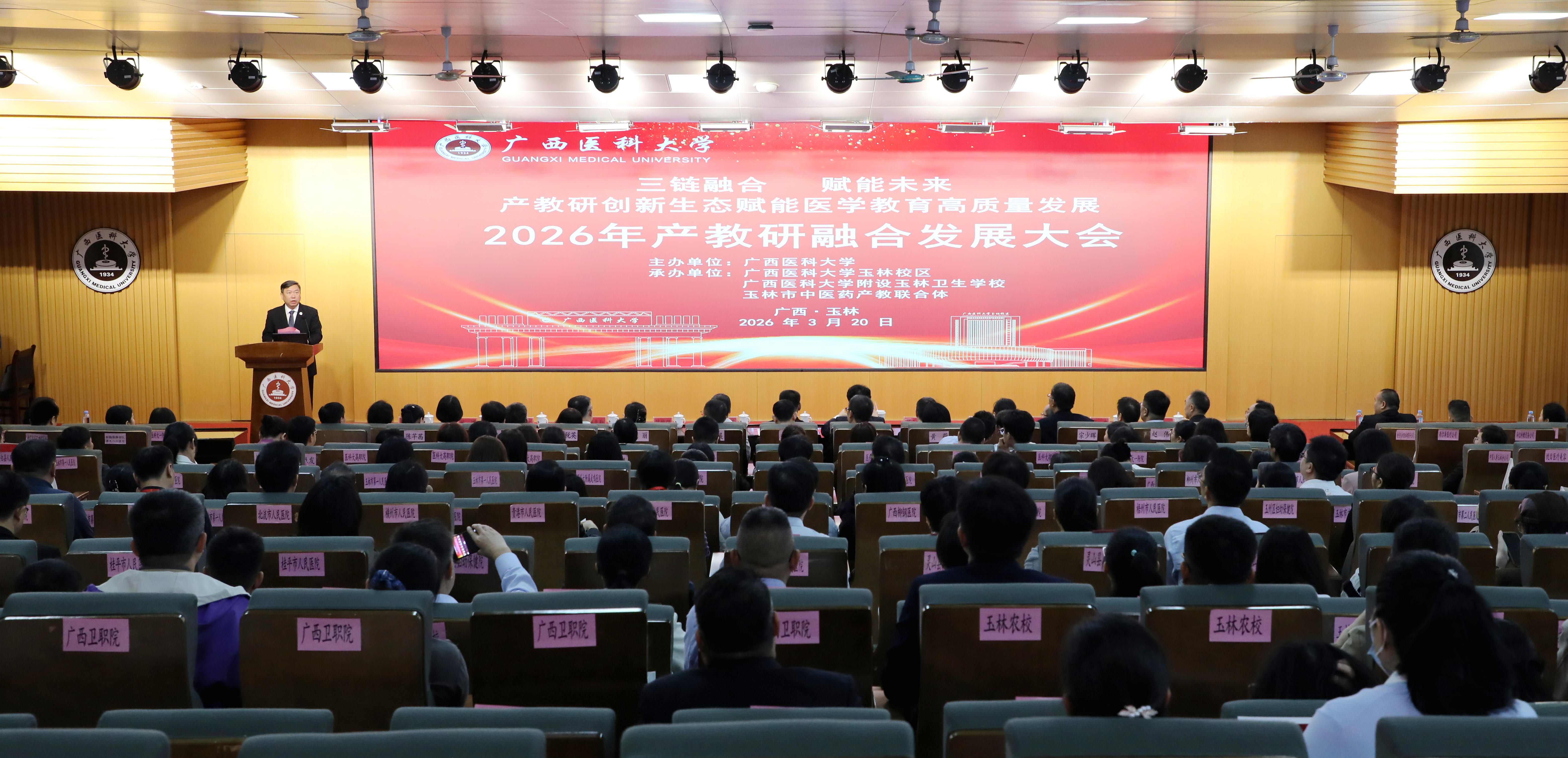 3月20日,广西医科大学2026年产教研融合发展大会在我校玉林校区6号楼一楼报告厅召开。学校党委书记陈川、校长曾志羽,玉林市委常委、统战部部长、副市长范小花出席,自治区、玉林市相关部门负责人,玉林校区战略合作医院、实习单位、就业单位,玉林市中医药产教联合体成员单位,全区医药卫生类高校、中职学校的领导、嘉宾,以及我校各附属医院、教学医院、相关职能部门代表及师生代表参会。学校副校长陈俊强主持开幕式。