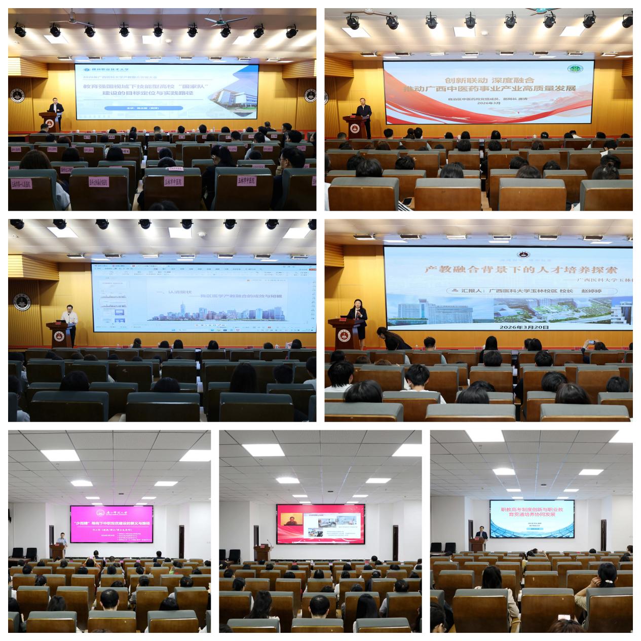 主会场上,柳州职业技术大学副校长陈正振教授作《教育强国视域下产教融合的现代职业教育体系》专题分享,为学校深化产教融合、推进职教本科建设提供了宝贵经验、清晰路径和重要启示。在大健康产教融合论坛和职业教育分论坛两个分会场上,自治区中医药局副局长庞清,自治区卫生健康委科教处副处长黄东明,玉林校区、附设玉林卫生学校校长赵婷婷,民政职业大学老年福祉学院院长屠其雷,广西师范大学职业技术师范学院副院长邓小华,南宁师范大学职业技术师范学院教授逯长春等专家学者围绕中医药产业产教融合发展、大健康领域三链融汇、人才培养、双优建设、职教高考等方面展开深入研讨,凝聚合作共识。