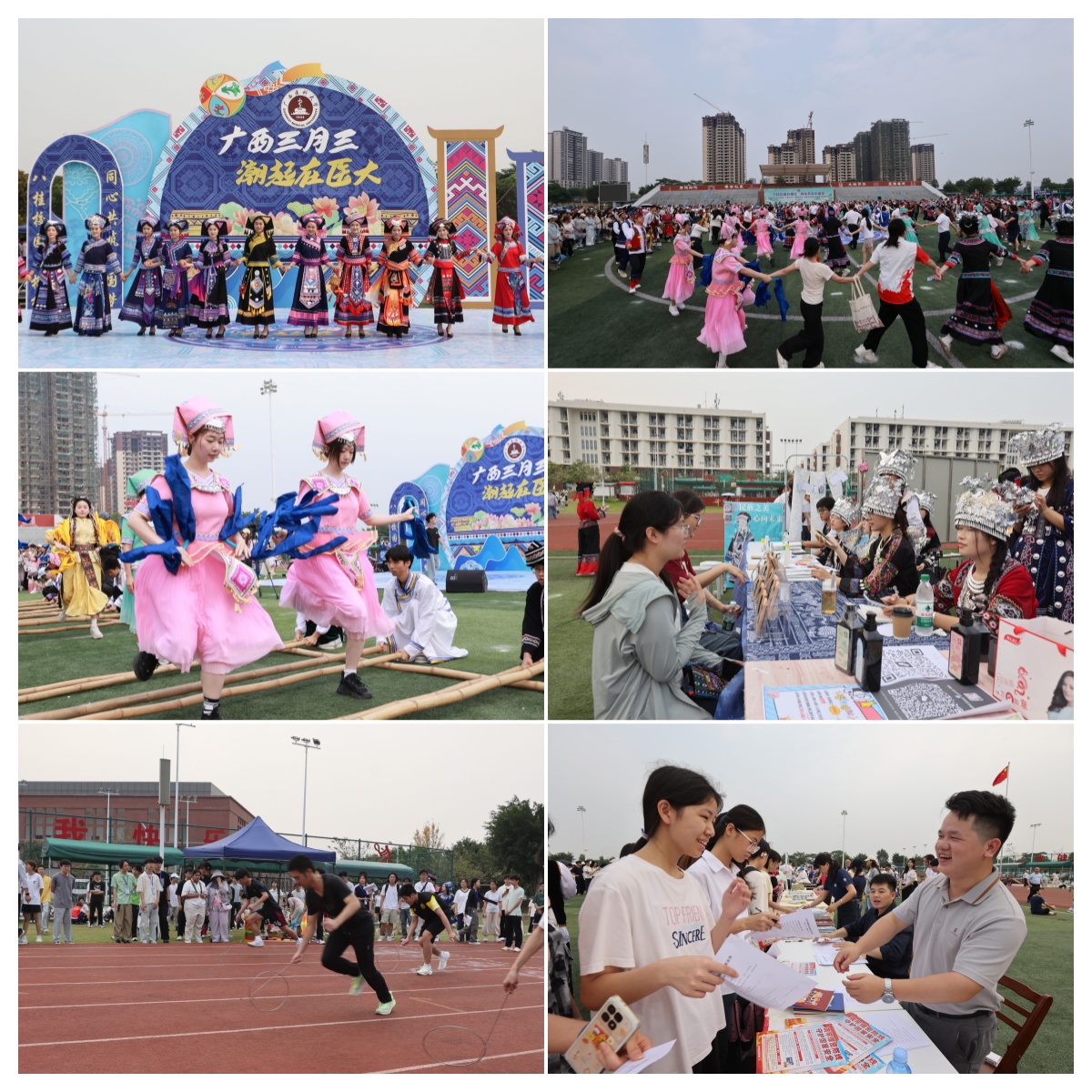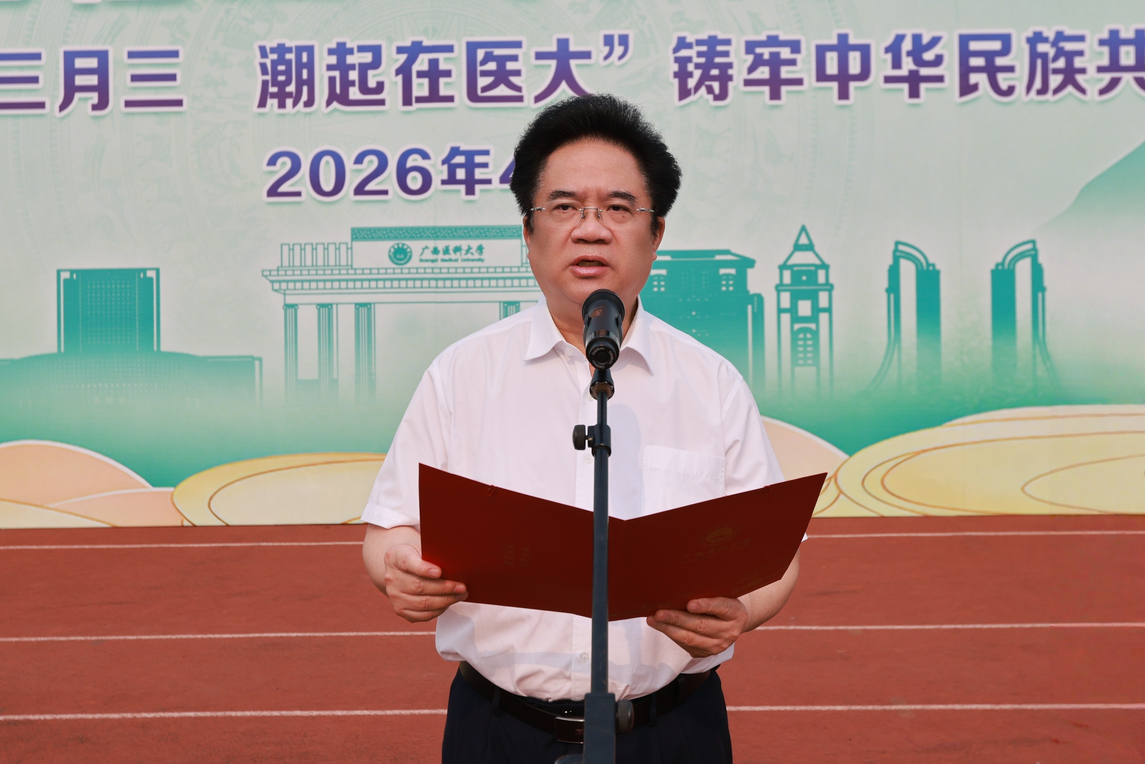 壮乡春深,歌潮花海,“三月三”将至。4月11日上午,2026年“广西三月三·潮起在医大”铸牢中华民族共同体意识宣传月活动开幕式在武鸣校区田径场举行,引导师生铸牢中华民族共同体意识,营造庆祝“广西三月三”的喜庆氛围。学校党委书记陈川致辞并宣布宣传活动月开幕,校长曾志羽主持开幕式。副书记刘灵光、驻校纪检监察组组长韦敏观,副校长卢德成、廖红兵,各相关职能部门负责人、二级党组织书记、师生代表1700多人参加活动。