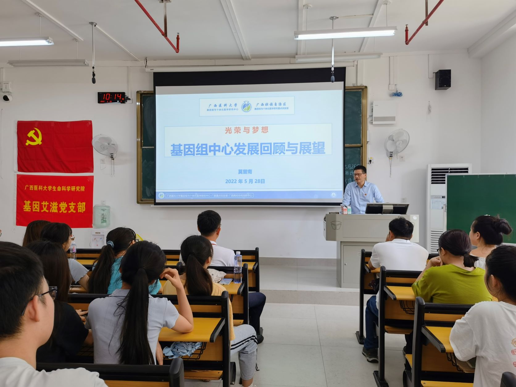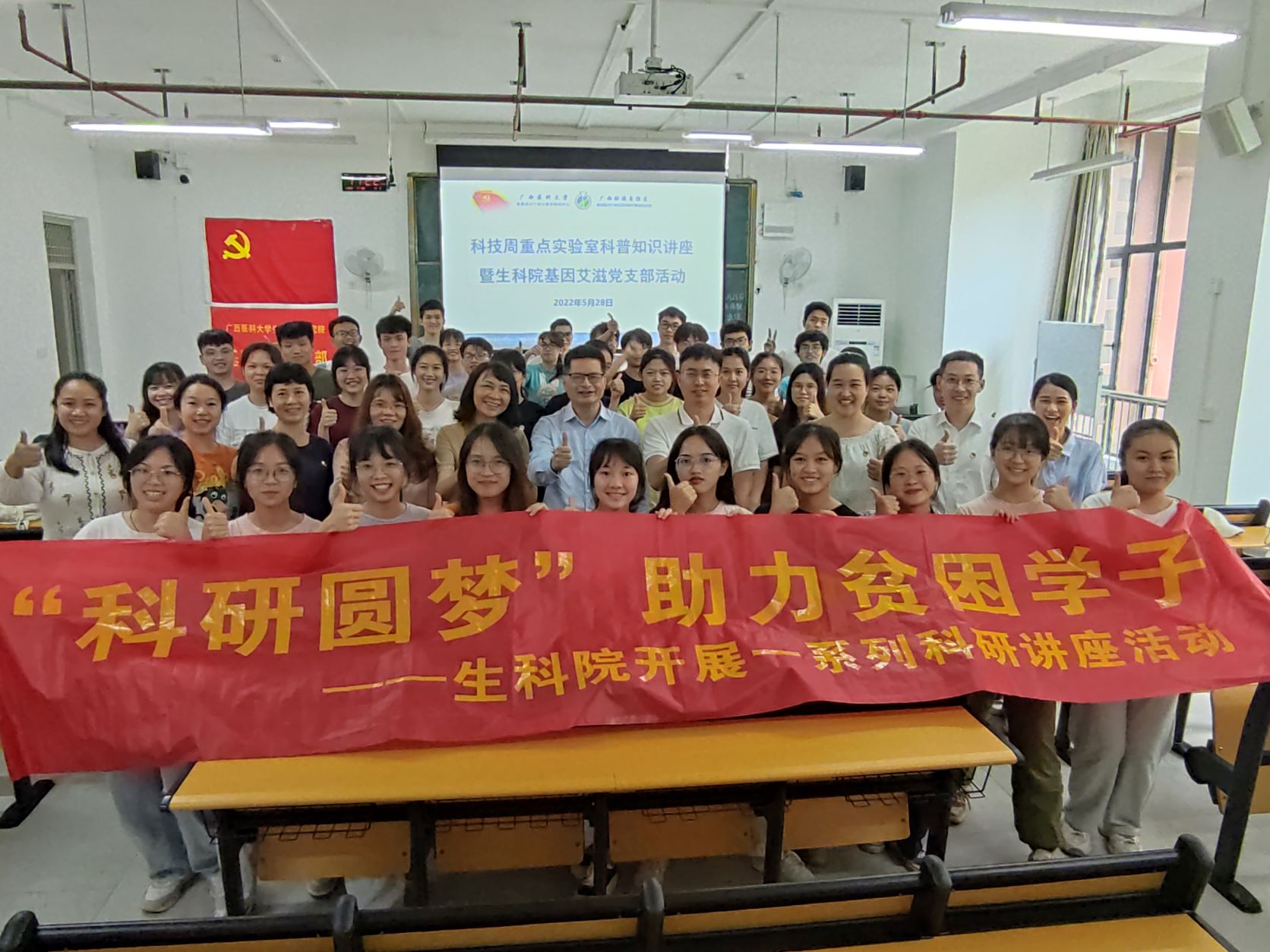 2022年5月28日上午,生命科学研究院基因艾滋党支部在武鸣校区A2教学楼开展科技周重点实验室科普知识讲座。支部党员、教职工以及医学实验技术、临床医学专业的近百名学生参加了本次活动,校党委副书记莫曾南同志以普通党员身份参加活动。
