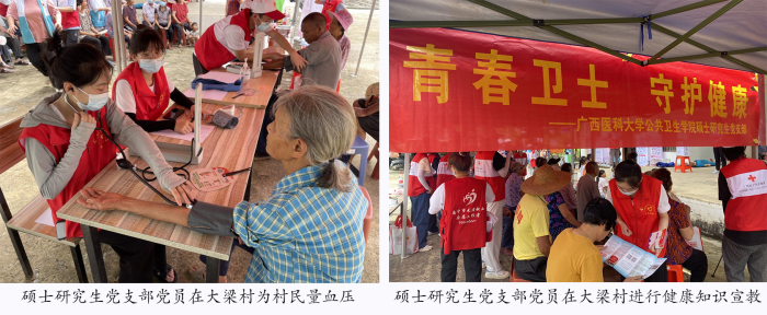 活动围绕传染病防控和“三献”知识、疫情防控措施、“禁毒防艾”、健康义诊和应急救护知识技能培训等内容开展;凝聚了全国高校“百个研究生样板党支部”战斗堡垒力量,支部党员先行带动志愿者们开展小学生防溺水情景剧宣传教育、心肺复苏和儿童海姆立克急救法演示等健康宣教,党员带头入户走访慰问脱贫户、深度对话老党员、深入开展居民健康素养调查,积极引导群团组织参与抓党建促乡村振兴,以党建激活群团建设,实现党建与志愿服务深度融合,着力推进宜居宜业美丽乡村建设,助力“健康广西”快速发展。