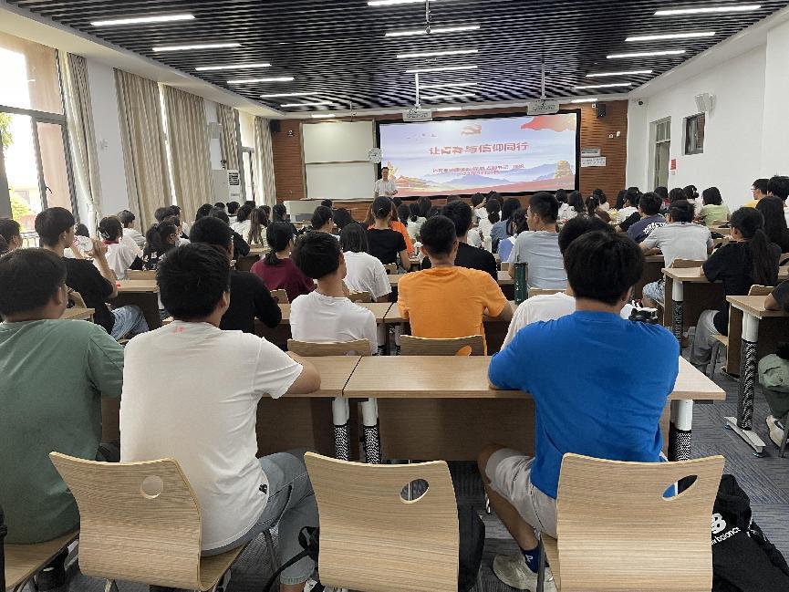 首先,学院党总支副书记覃耀春开展了题为《让青春与信仰同行》的专题讲座,他从信仰的力量导入,自中国共产党的诞生、中国共产党的性质和宗旨、百年奋斗重大成就逐一展开,介绍了党团结带领全国各族人民创造的伟大成就,再从历史的选择、时代的选择和青年的成长需要,讲述了成为一名中国共产党党员的伟大意义。覃耀春副书记还介绍了入党的程序和基本要求,号召同学们心怀理想,志存高远,以实际行动积极向党组织靠拢。