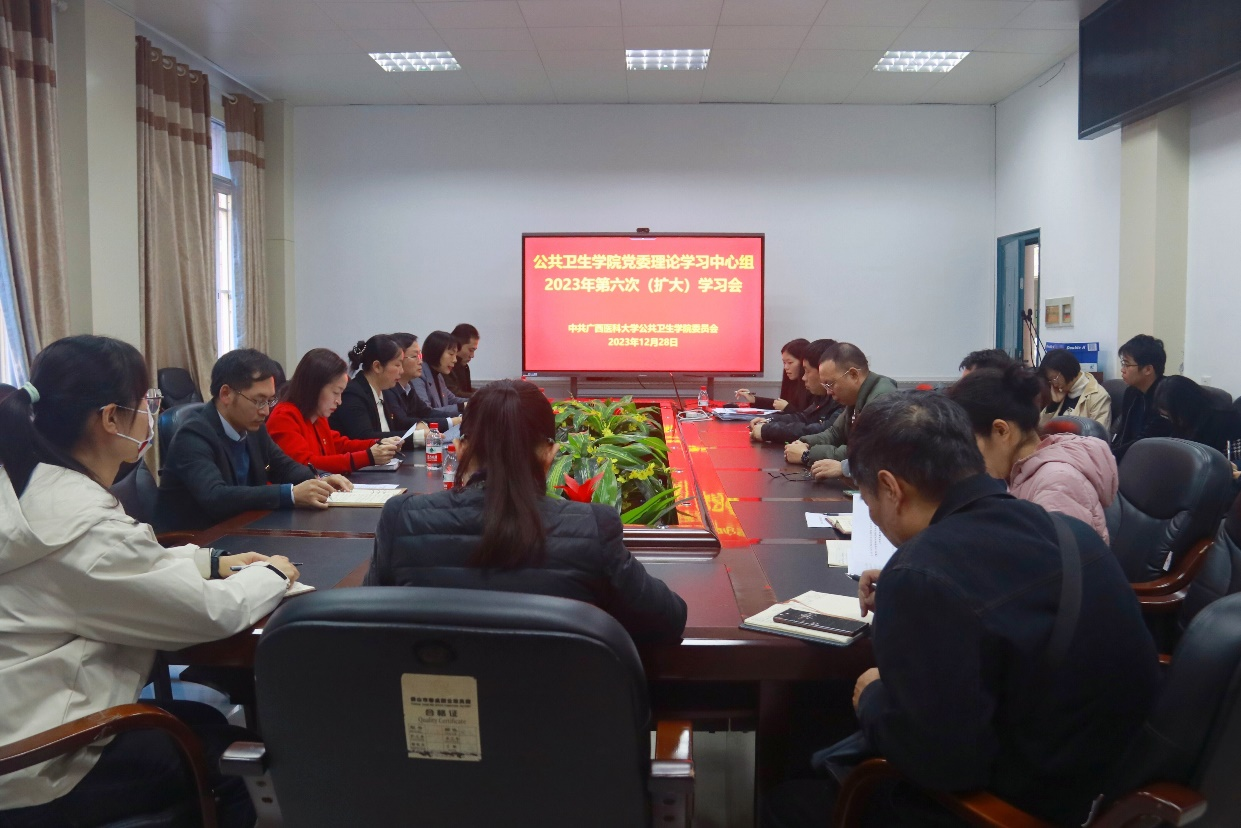 12月28日下午,公共卫生学院党委理论学习中心组2023年第六次(扩大)学习会在109馆一楼会议室召开。学院党委委员、党支部书记、各科室/教研室负责人、党外代表人士参加会议,会议由党委书记苏莉主持。