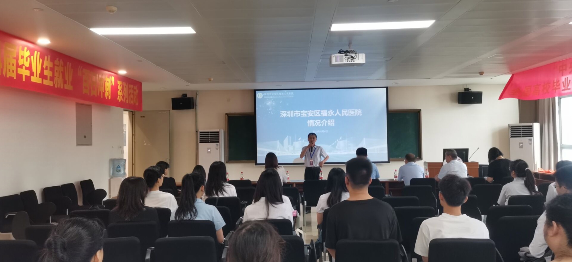 近日,深圳市宝安区福永人民医院专场招聘活动在南宁-校本部卓越楼七楼路演厅举行。本次招聘会提供了50个就业岗位,吸引了众多毕业生参加。