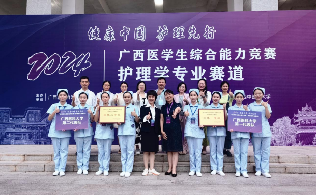 2024年9月25日,由广西壮族自治区教育厅主办的2024年广西医学生综合能力竞赛(护理学专业赛道)在广西中医药大学仙葫校区举行。经过激烈角逐,我校2支代表队表现出色,分别获得团体一等奖和二等奖,2名选手荣获优秀选手奖,4名教师获优秀指导教师奖,为即将到来的90周年校庆献礼。
