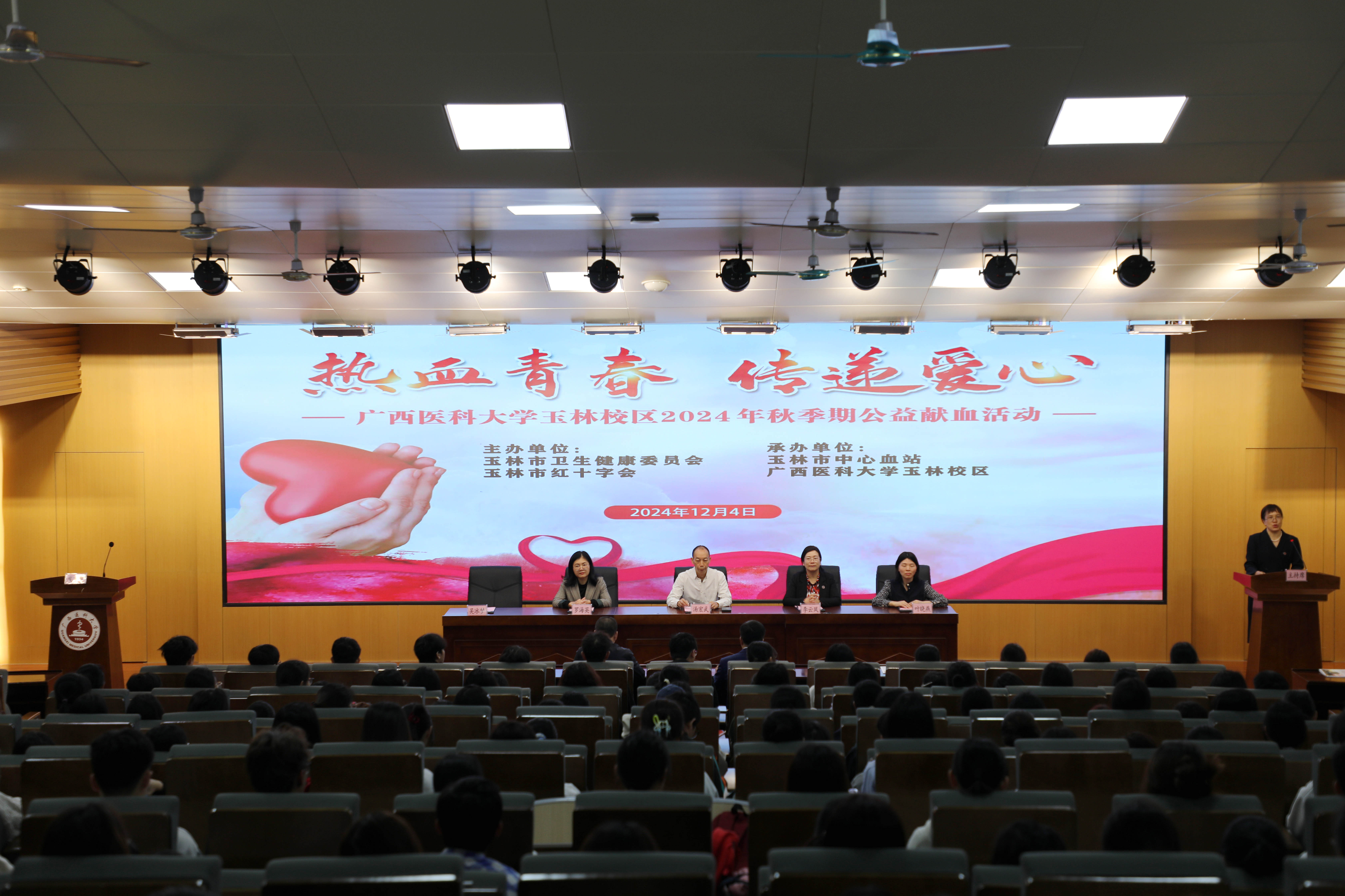 为弘扬社会责任感,传递爱心和温暖,12月4日,2024秋季期公益献血活动启动仪式在玉林校区6号楼一楼报告厅举行。玉林市卫生健康委员会四级调研员汤宏武,玉林校区、附设玉林卫生学校党委副书记李云凤,玉林市红十字会专职副会长罗海英,玉林市中心血站站长叶晓燕,以及师生代表共500余人参加活动。