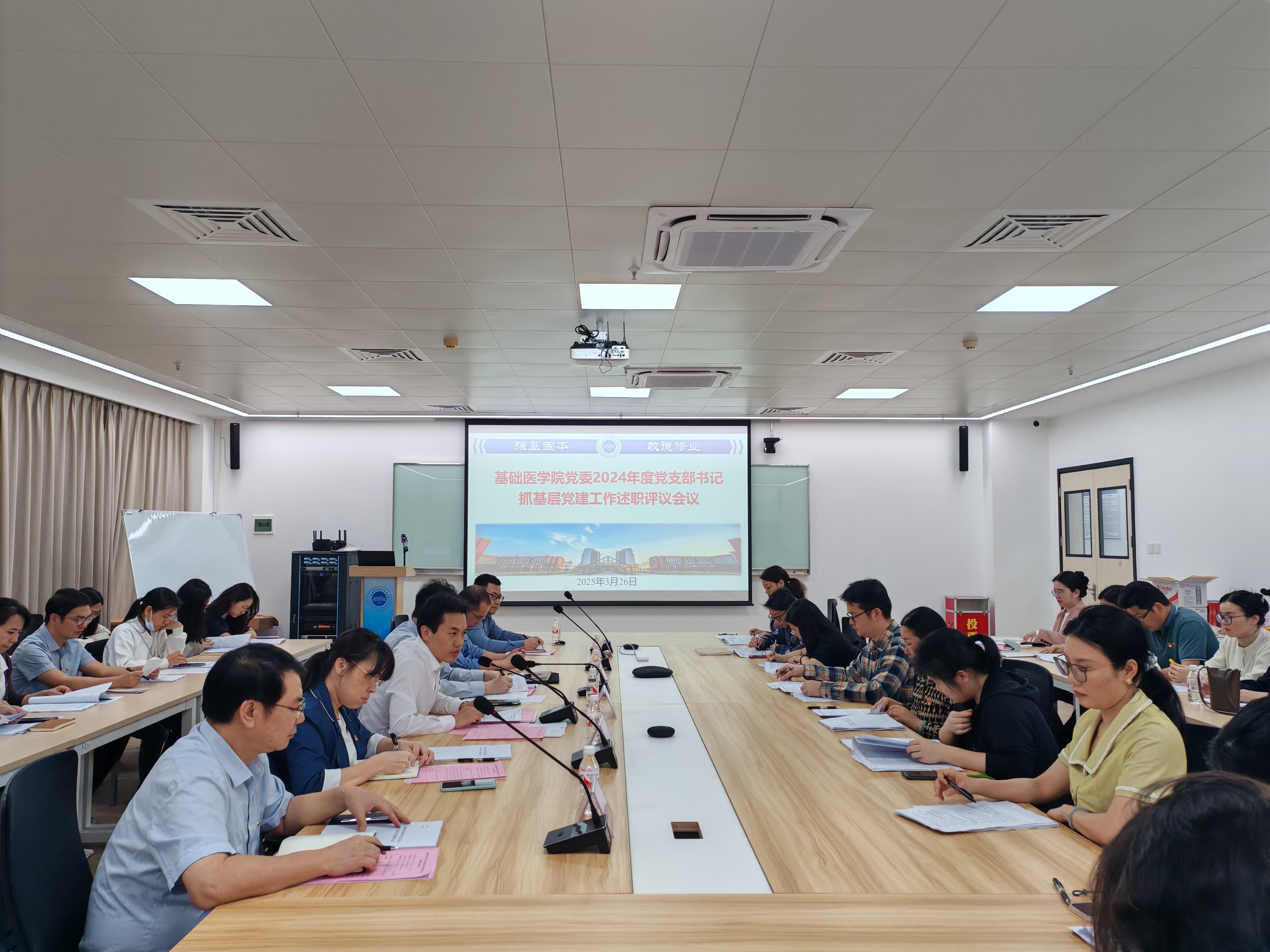 3月26日晚,基础医学院党委在药基楼514会议室召开2024年度党支部书记抓基层党建工作述职评议会。学校第一附属医院、第一临床医学院党委书记李浪到会指导,基础医学院全体党委委员、党支部书记及党员代表参加会议,学院党委书记谭国鹤主持会议。