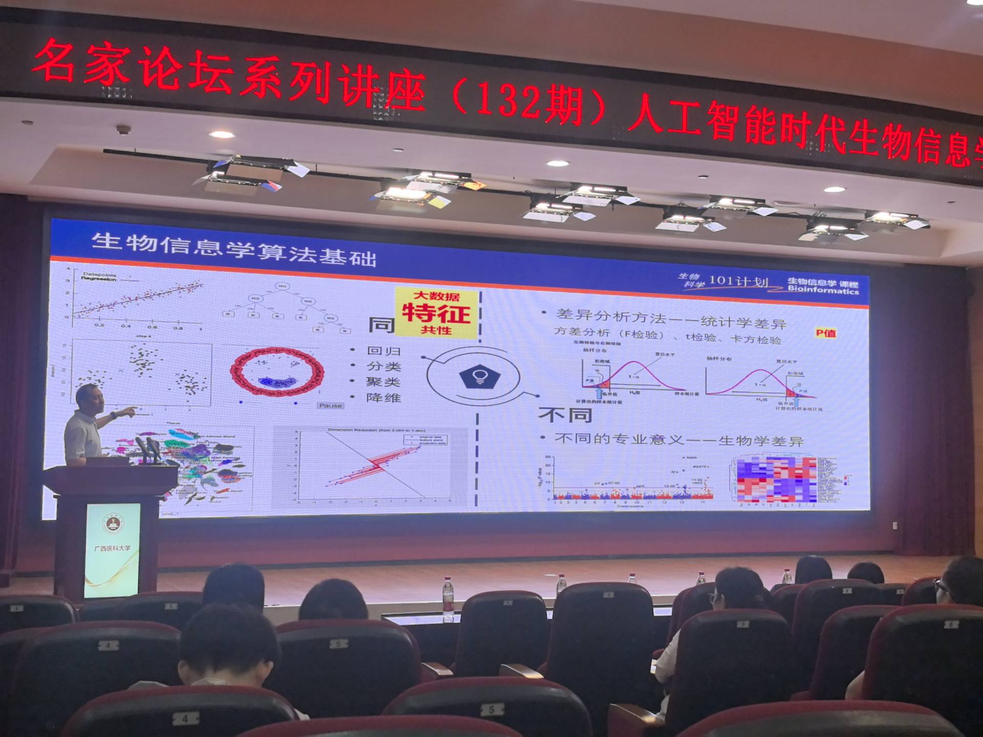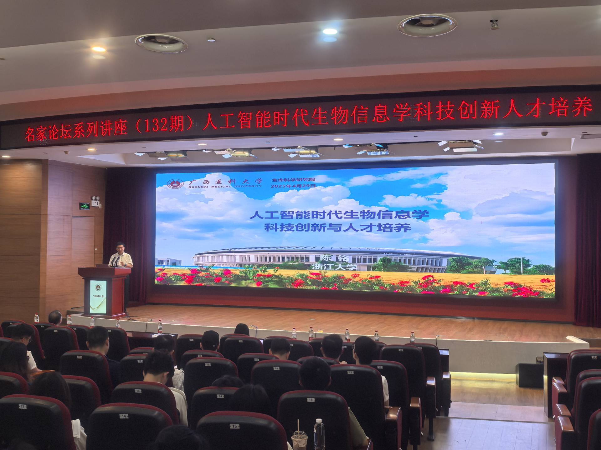 为推进医工交叉学科建设,4月29日,生命科学研究院/生命科学与医学工程学院在校本部科技楼报告厅举办广西医科大学"AI赋能医学"系列学术活动第六期专题讲座。特邀浙江大学生物信息学研究所所长陈铭教授作题为《人工智能时代生物信息学科技创新与人才培养》的学术报告。讲座由生命科学研究院/生命科学与医学工程学院院长梁浩主持,百余名师生参与交流。
