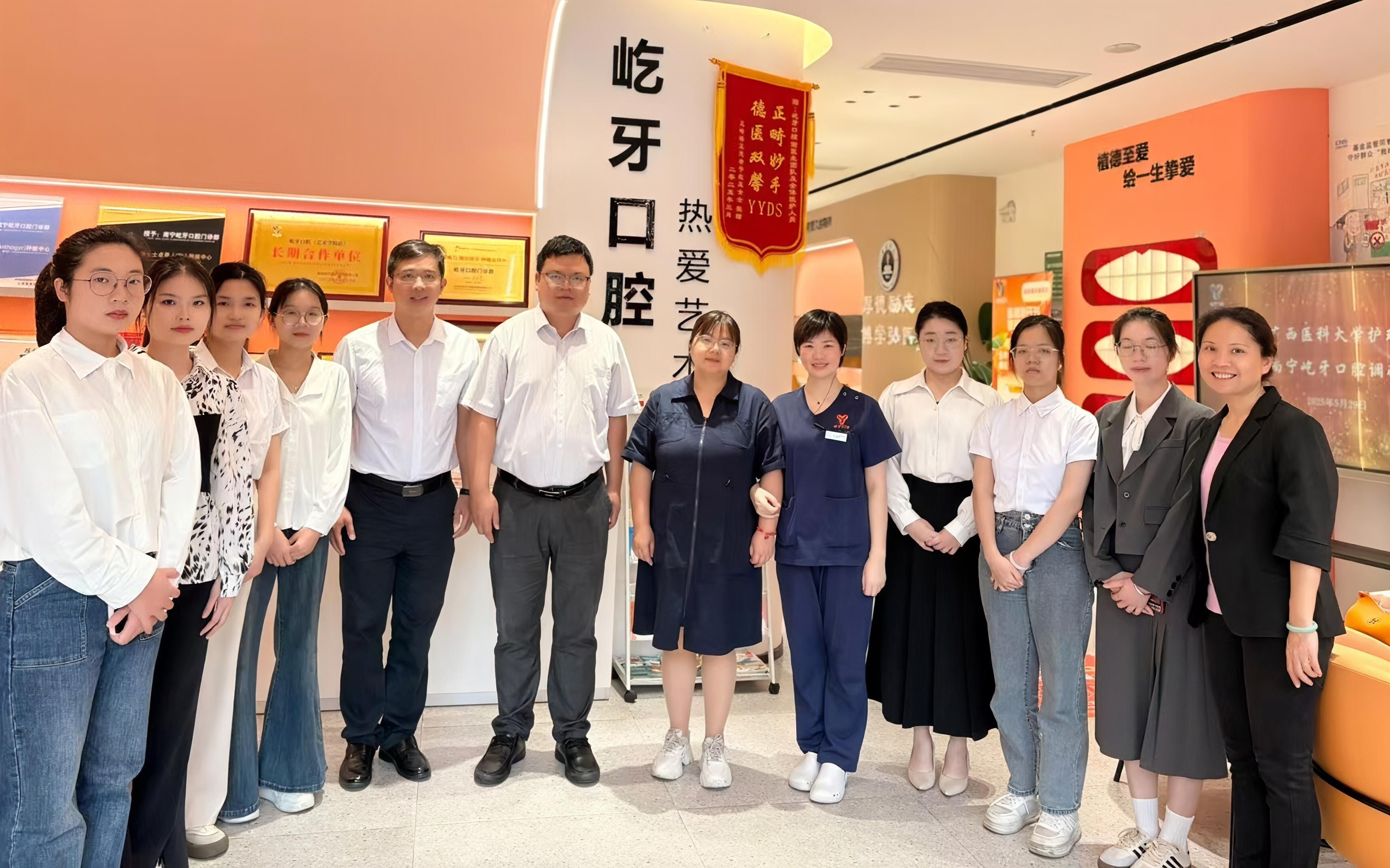 为加强校企合作,拓宽毕业生就业渠道,5月29日下午,护理学院党委书记谭机永、副院长刘媛航与毕业班辅导员赴南宁市屹牙口腔开展访企拓岗专项行动。