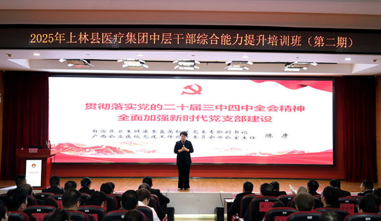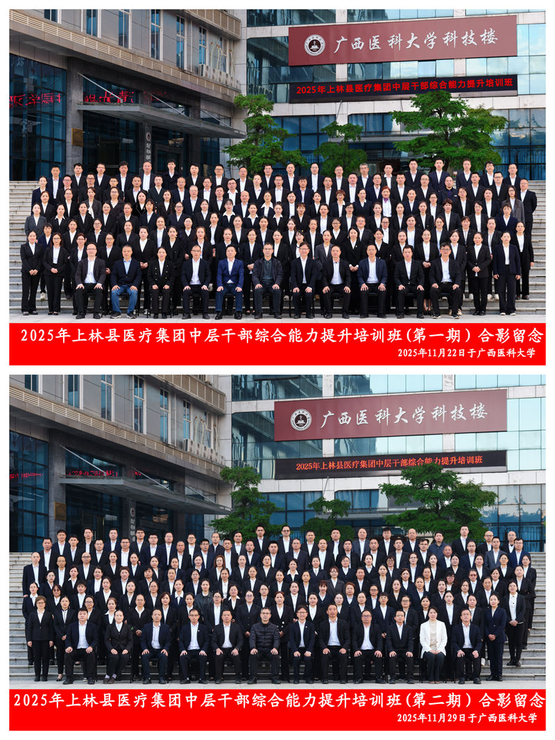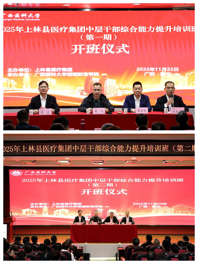 11月21日至23日、11月28日至30日,由继续教育学院承办的2025年上林县医疗集团中层干部综合能力提升培训班(共两期)在校本部举办。上林县卫生健康局党组书记、局长谢飞,县医疗集团、人民医院党委书记蒋益宝,县医疗集团、人民医院院长黄君书,继续教育学院院长周波等出席开班仪式,副院长韦先良主持开班仪式。上林县医疗集团250余名中层干部参加培训,集中“充电赋能”。