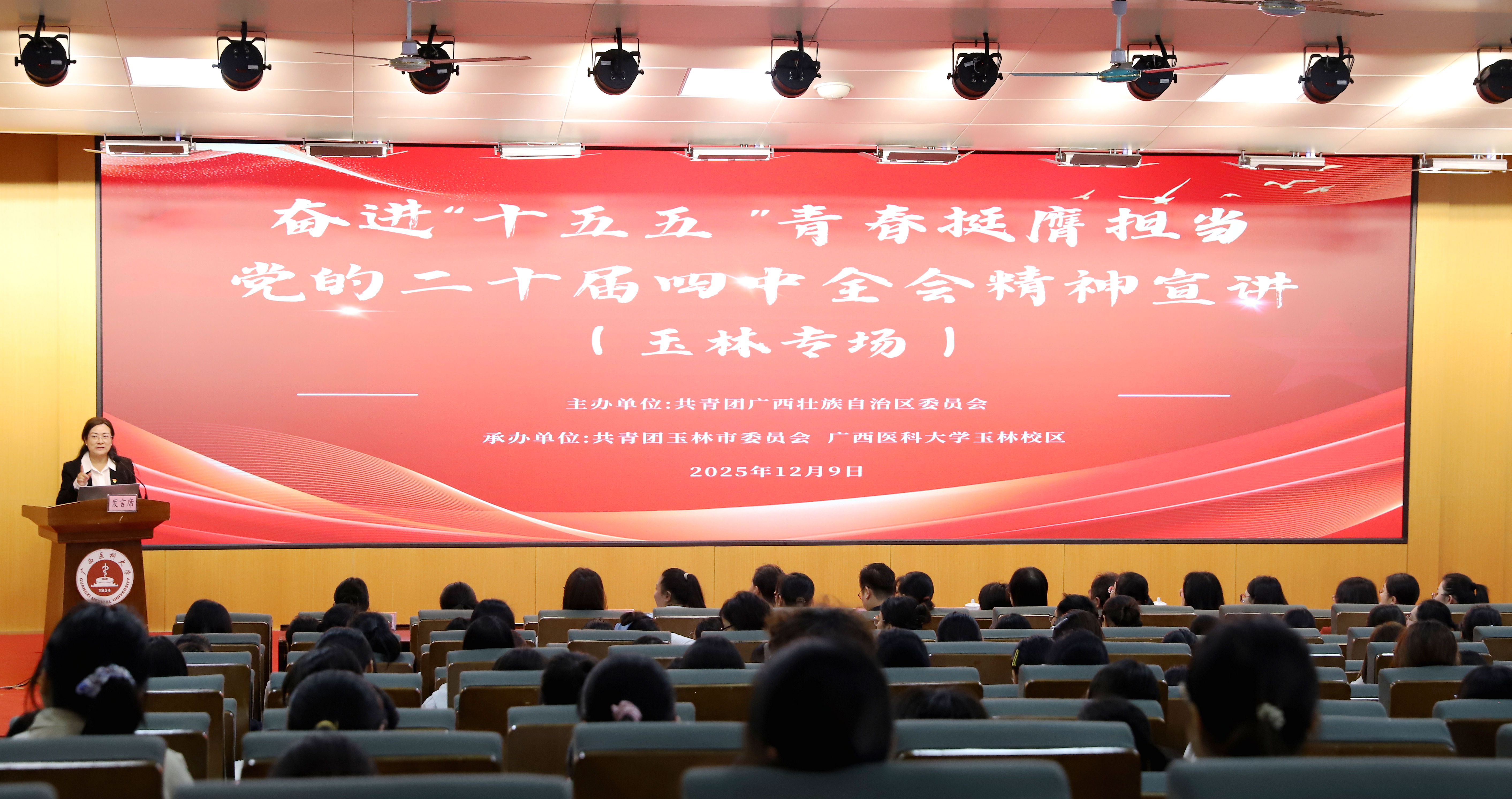 12月9日,由共青团广西壮族自治区委员会主办,共青团玉林市委员会、广西医科大学玉林校区承办的奋进“十五五”青春挺膺担当 党的二十届四中全会精神宣讲活动在广西医科大学玉林校区成功举行,玉林校区近500名在校师生参加。