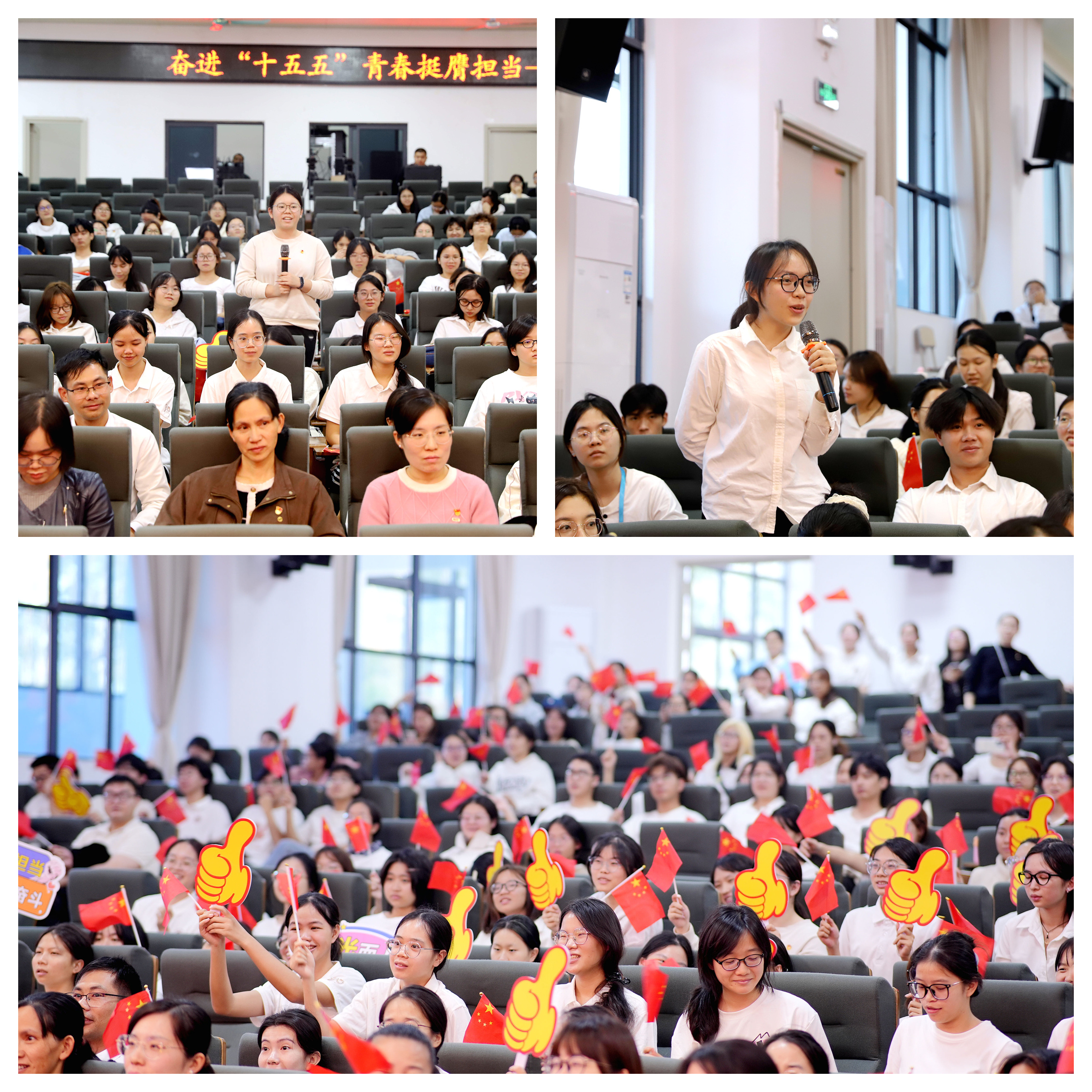 6位“80、90、00后”广西青年讲师团成员们来自不同行业领域的优秀青年讲师,围绕低碳经济、卫国戍边、青年文化交流、路桥基建、绿色发展等主题,紧扣“高质量发展”与“青年担当”主题,结合自身工作岗位和实践经历,呈现了一场有深度、有温度、有力度的青年理论宣讲。宣讲现场气氛热烈,师生们全神贯注,不时报以阵阵掌声。