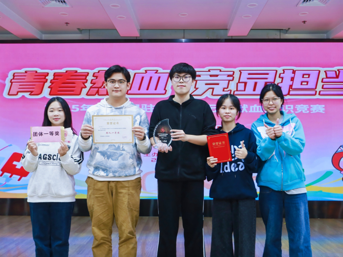 为进一步提升高校大学生对无偿献血的认知,激励更多学子投身无偿献血事业,南宁市中心血站于2025年11月10日-29日举办了“青春热血,竞显担当”2025年驻邕院校无偿献血知识竞赛。我校学生黄方炅、李蓝香、黎阳芳、刘奕昕、陈颖虹默契配合、沉着应战,以234.5分的优异成绩斩获决赛团体一等奖。