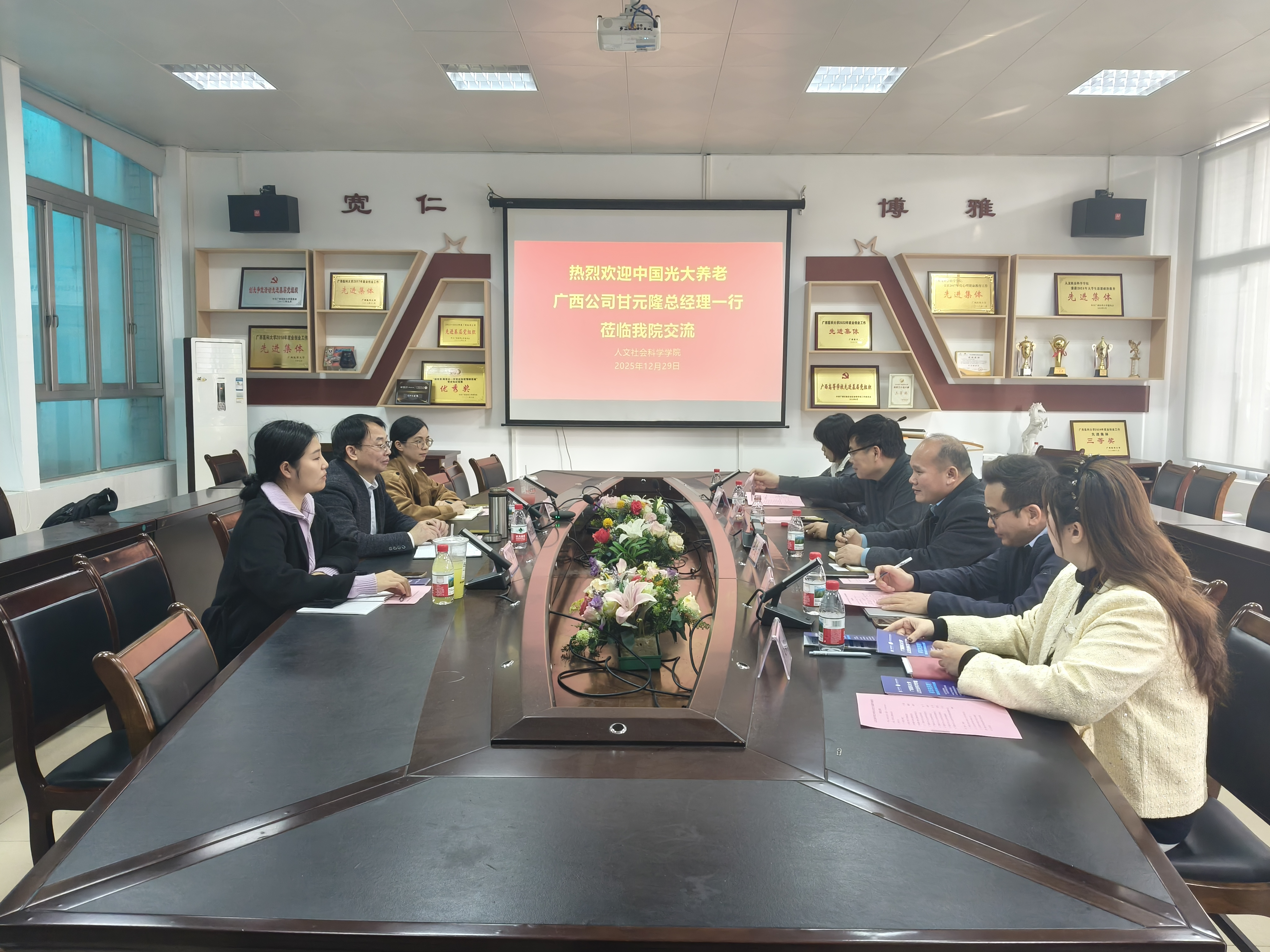 为推动养老服务管理专业建设,深化产教融合,12月29日下午,中国光大养老广西区域总经理甘元隆一行到访广西医科大学人文社会科学学院,双方就共建实践教学基地、共育康养领域专业人才进行了座谈交流。学院党委书记唐忠、院长许海东及相关教师代表参加座谈。