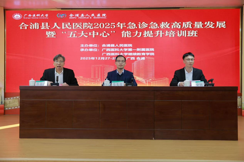 12月26日至12月28日,由广西医科大学第一附属医院和广西医科大学继续教育学院联合承办的合浦县人民医院2025年急诊急救高质量发展暨“五大中心”能力提升培训班在合浦举办。合浦县人民医院副院长卓家铭、广西医科大学继续教育学院副院长韦先良出席开班仪式并致辞,开班仪式由合浦县人民医院副院长廖品兴主持。合浦县人民医院各临床科室负责人及相关医护人员,急诊、重症、创伤中心骨干人员,应急管理相关人员约200人参加培训。