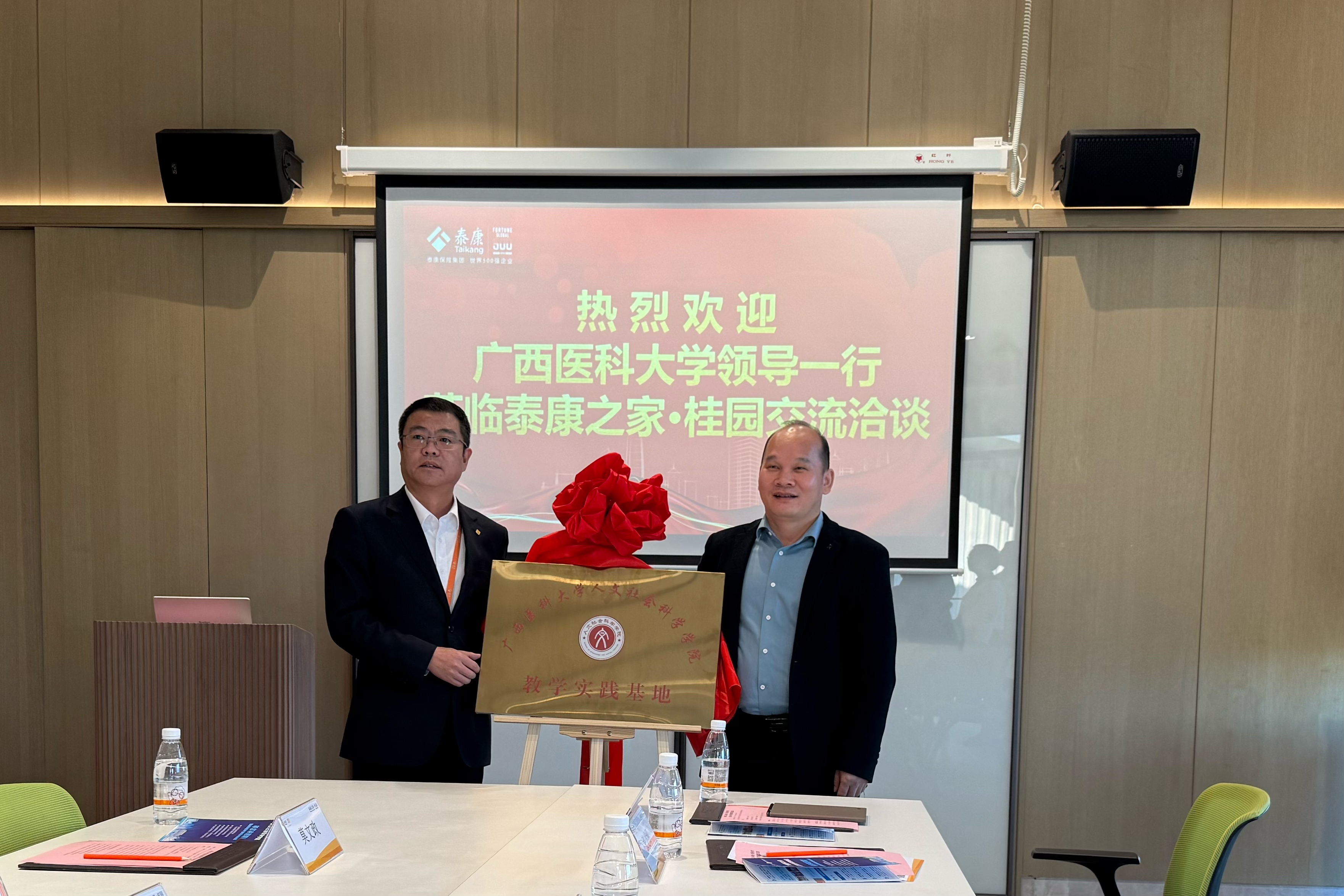 仪式上由泰康之家·桂园人力资源部总监刘玉娟主持。泰康之家·桂园总经理龚珅对学院一行的来访表示热烈欢迎,并介绍了泰康桂园参与本次活动的与会人员。许海东院长就人文社会科学学院的发展历程、学科建设,特别是养老服务管理等相关专业的人才培养情况进行了说明,促进了双方的深入了解。在简短的座谈交流后,双方共同为“广西医科大学人文社会科学学院教学实践基地”揭牌,标志着校企合作步入新阶段。