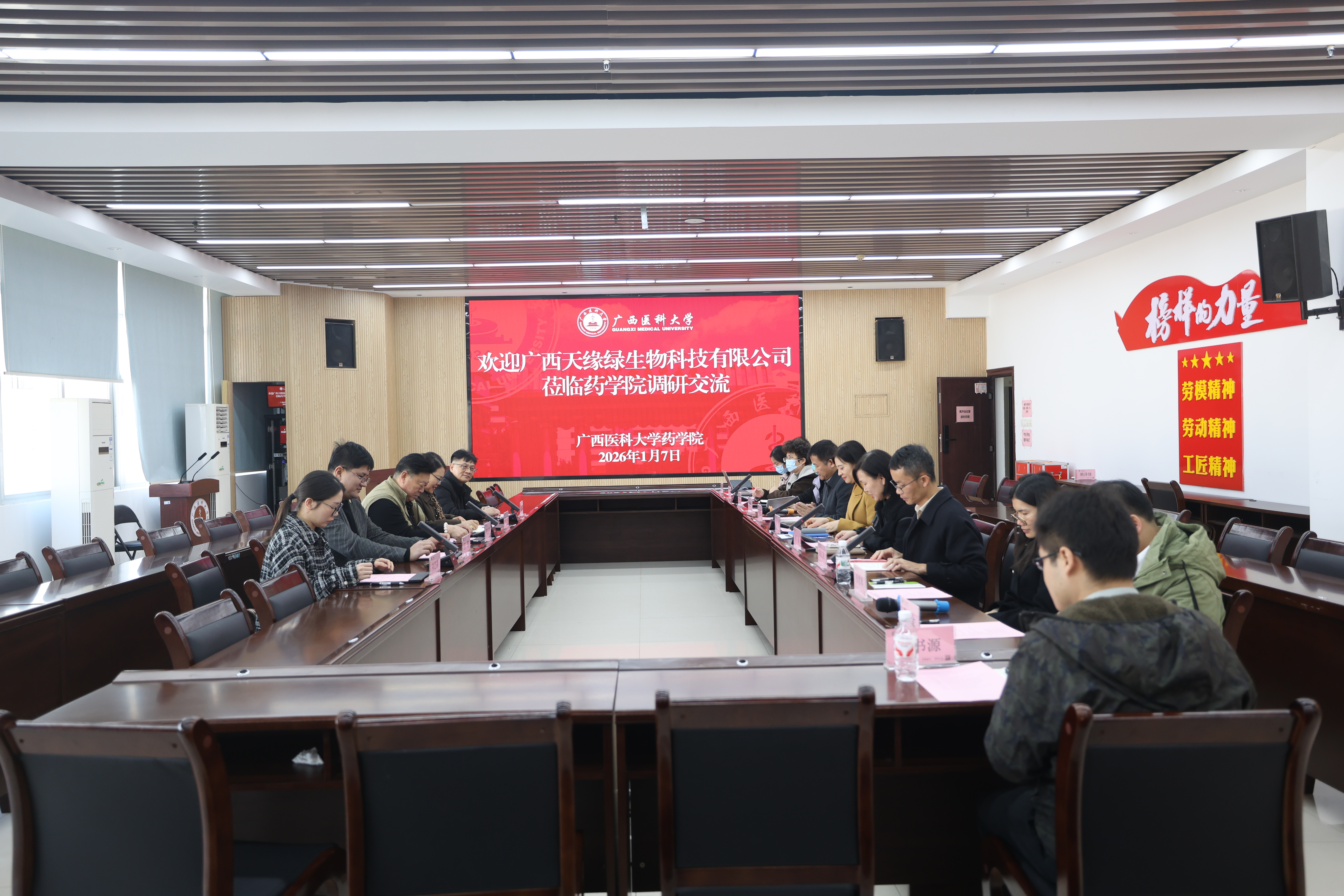 座谈会上,阳洁对天缘绿集团的回访表示热烈欢迎,介绍了学院在学科建设、师资力量、科研平台搭建及人才培养模式等方面的优势特色,重点聚焦壮药研发、天然药物提取等核心领域的科研成果与转化潜力。李玉强回顾了此前学院到访的交流成果,详细介绍了天缘绿集团在大健康产品研发、壮药资源产业化应用等方面的发展布局与核心需求。双方围绕壮药资源深度开发、健康产品创新研发、科研项目联合申报等核心议题展开深入探讨,一致认为校企应充分发挥各自资源优势,搭建长效合作机制,实现科研与产业的精准对接、人才与市场的高效匹配。