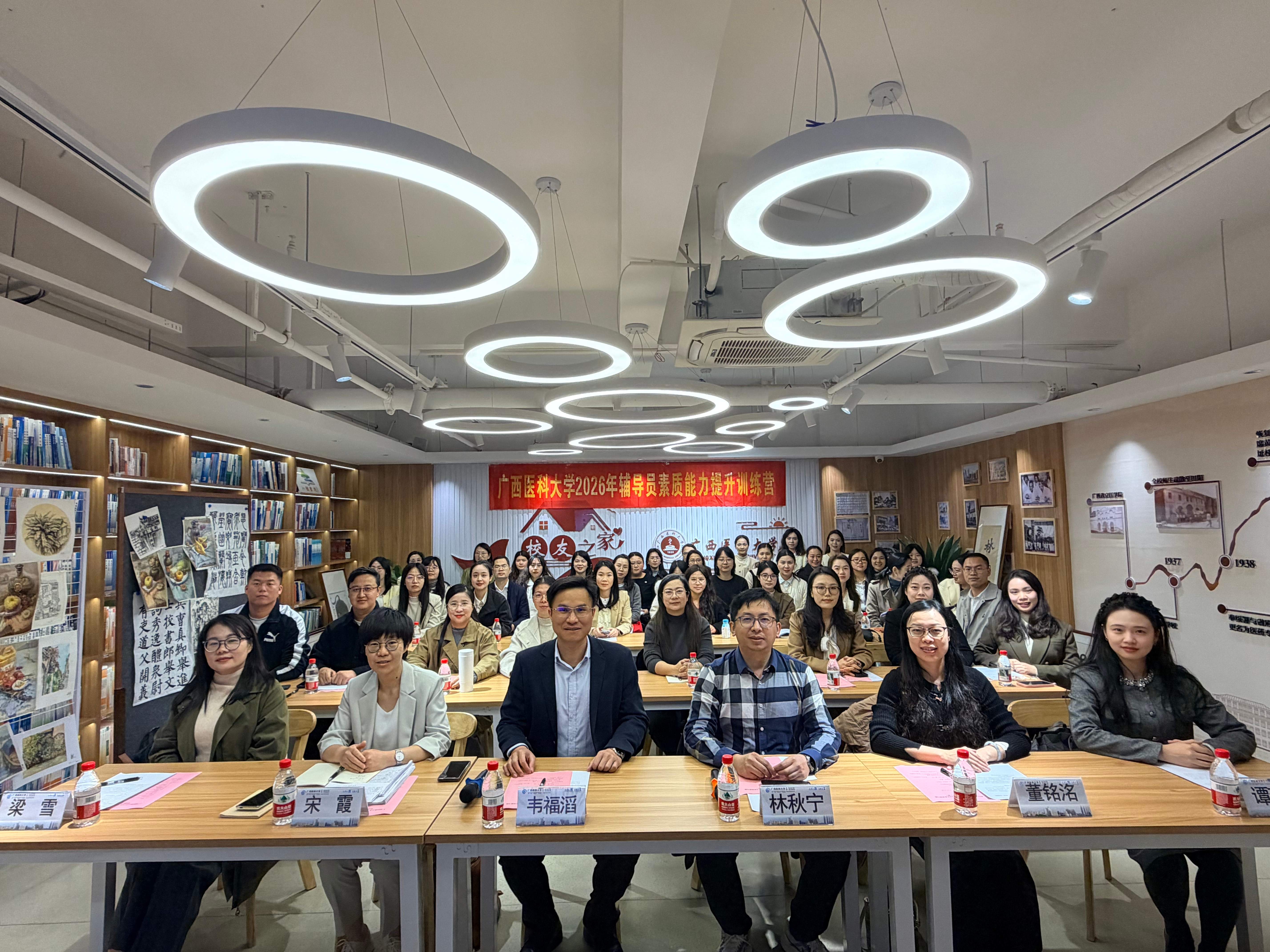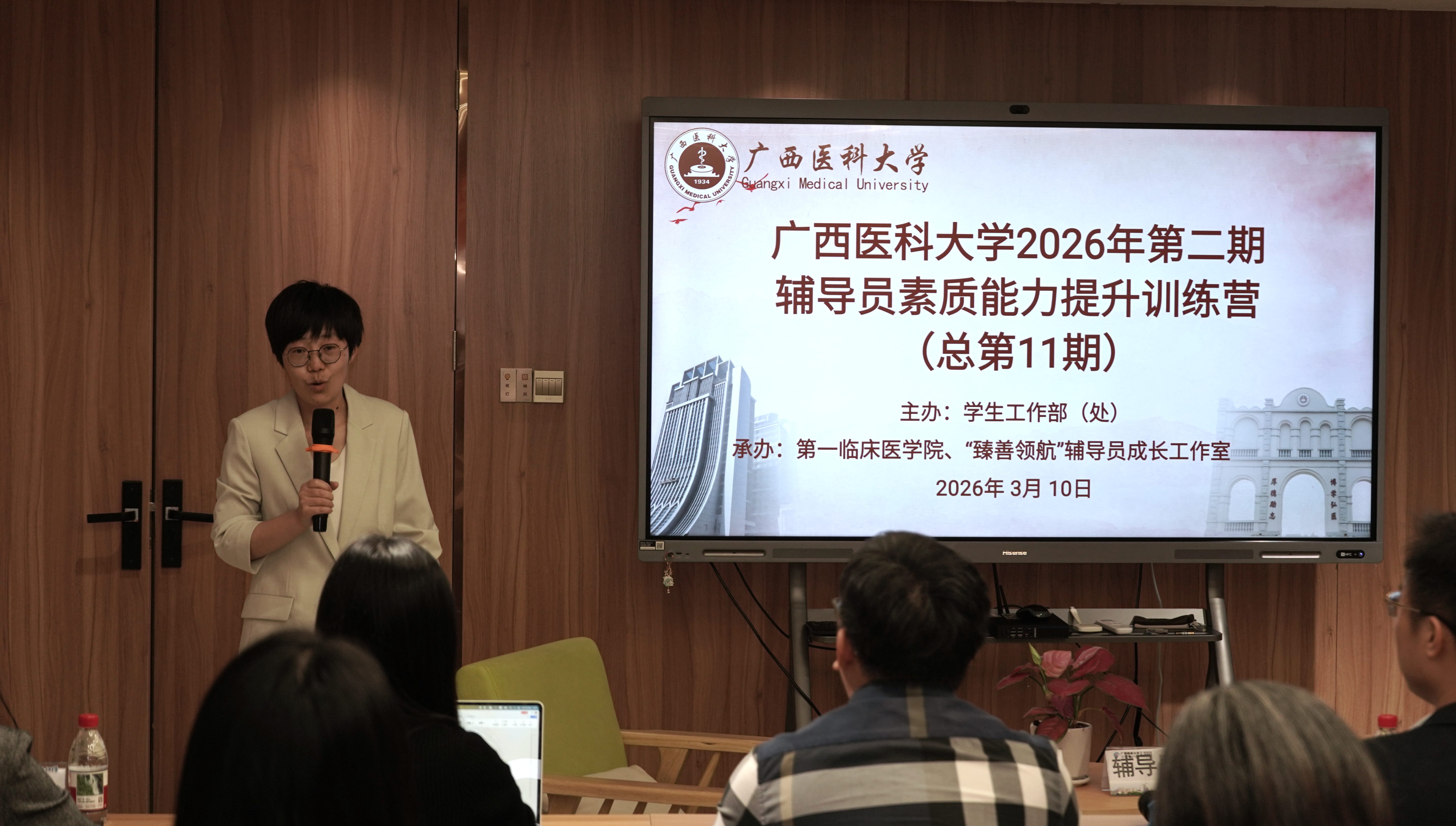 为夯实辅导员育人根基,锤炼专业履职能力,搭建校际交流互鉴平台,3月10日,我校2026年第二期辅导员素质能力提升训练营(总第11期)在校本部八桂书苑校友之家举办。活动由学生工作部(处)主办,第一临床医学院、“臻善领航”辅导员成长工作室承办,学生工作部(处)韦福滔副部(处)长出席活动,我校及广西建设职业技术学院专职辅导员近60人参加了本次活动。