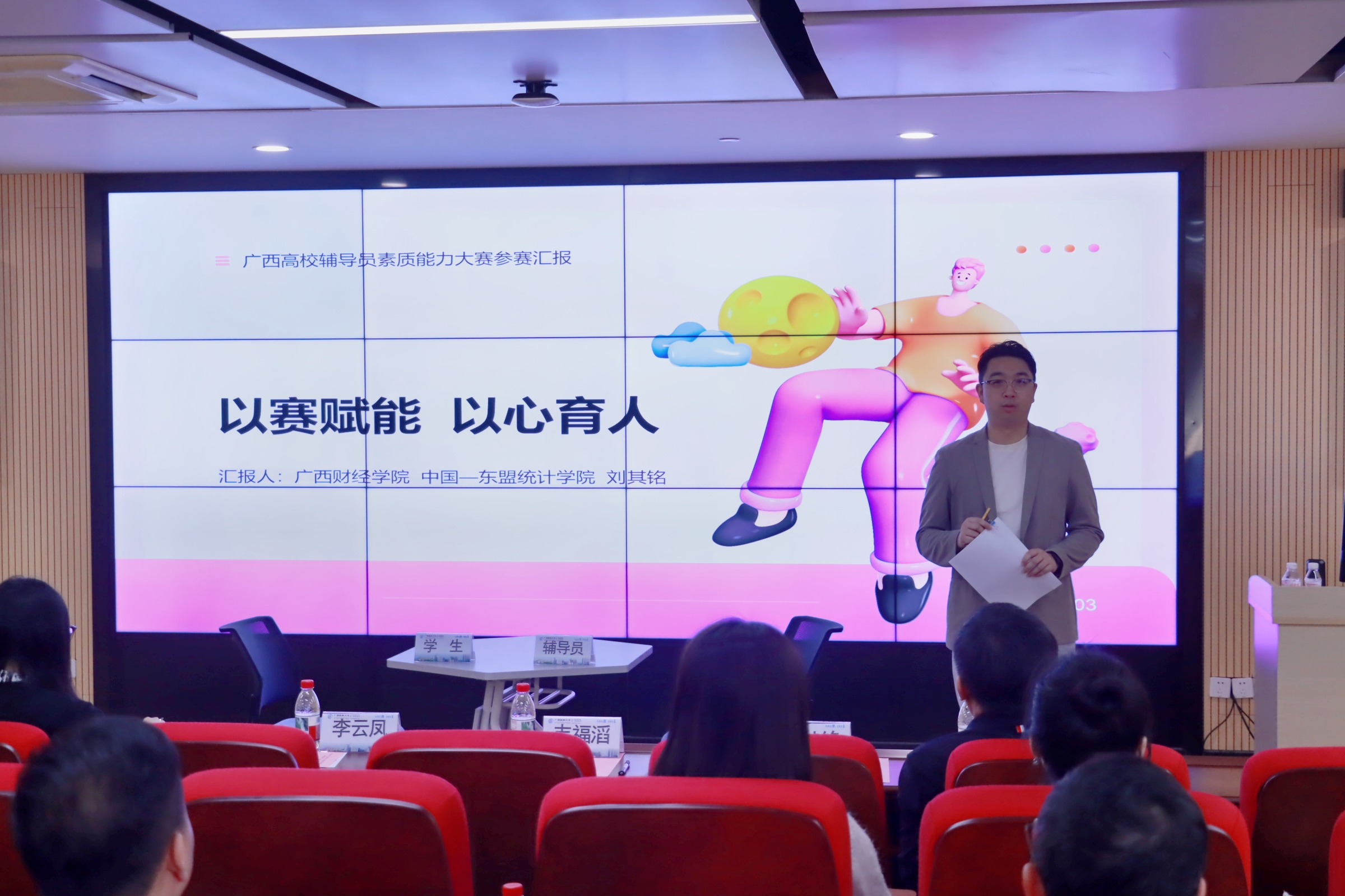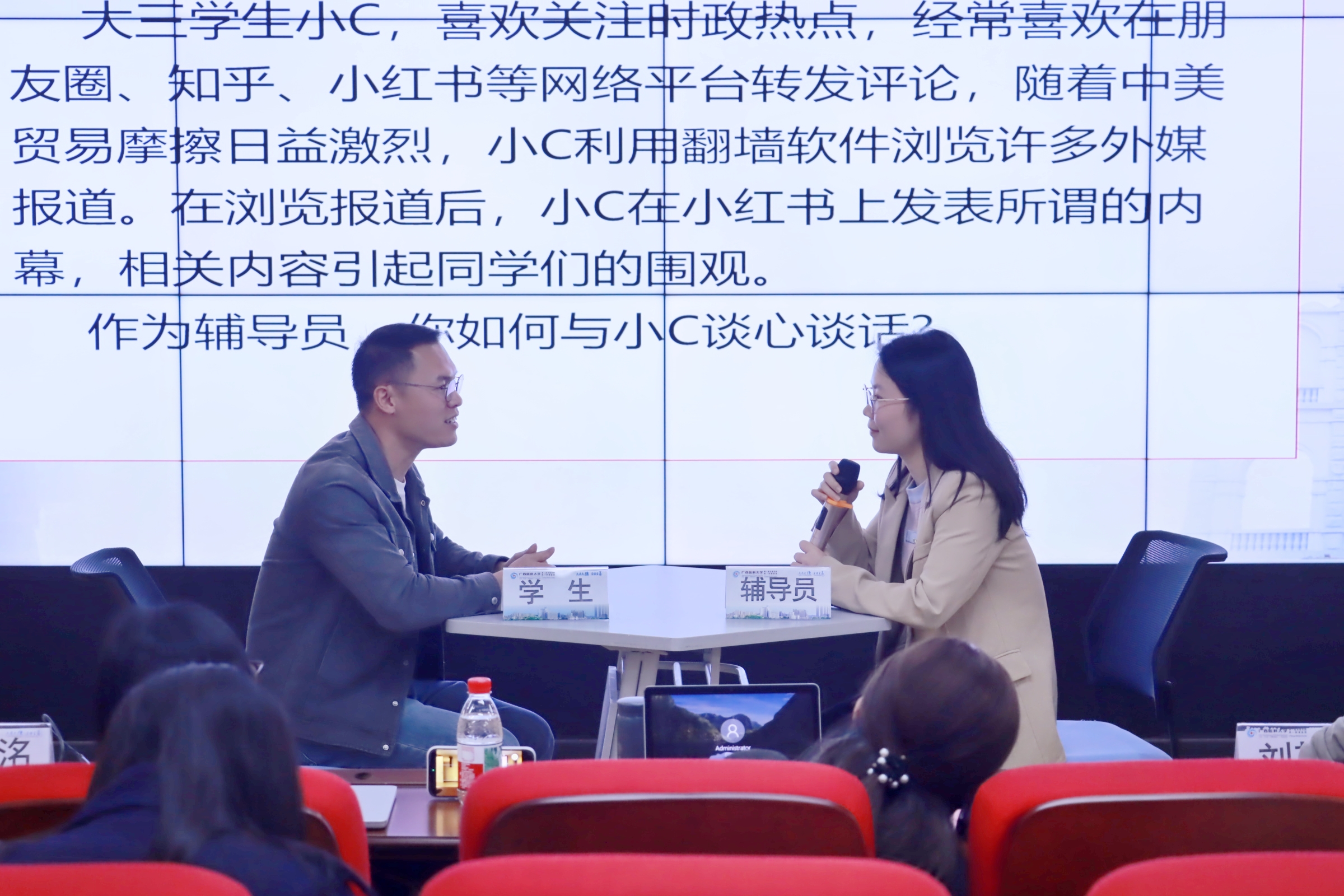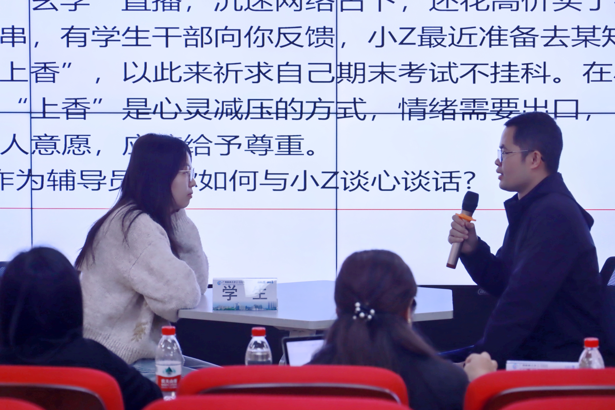 本次训练营以专题分享与实战演练为核心,聚焦谈心谈话能力提升。训练营邀请到连续两届获广西高校辅导员素质能力大赛一等奖及谈心谈话最佳表现奖、来自广西财经学院的刘其铭老师担任主讲。刘其铭以“以赛赋能 以心育人”为主题,围绕谈心谈话的破题思路、沟通技巧、情感把控等核心要点,展示实操流程与科学方法。他强调,做好谈心谈话工作的关键是先解决学生的情绪问题,及时做好疏导,再逐步引导学生找到“真问题”,通过共同探讨找到解决问题的办法,过程中注重传递“以生为本”的人文温度。2组参训辅导员围绕典型案例开展谈心谈话实战模拟,充分运用所学技巧开展沟通引导,展现出良好的职业素养。