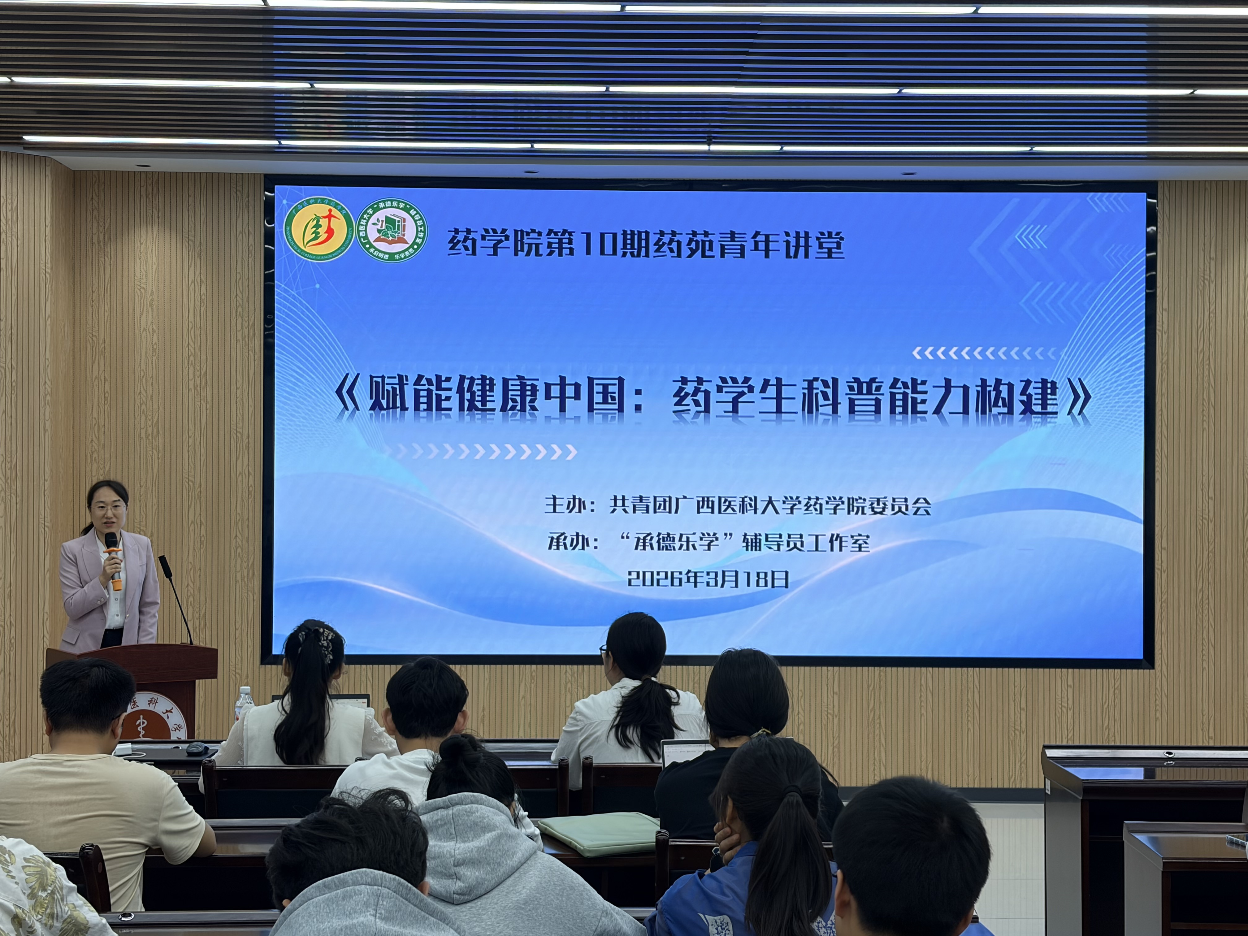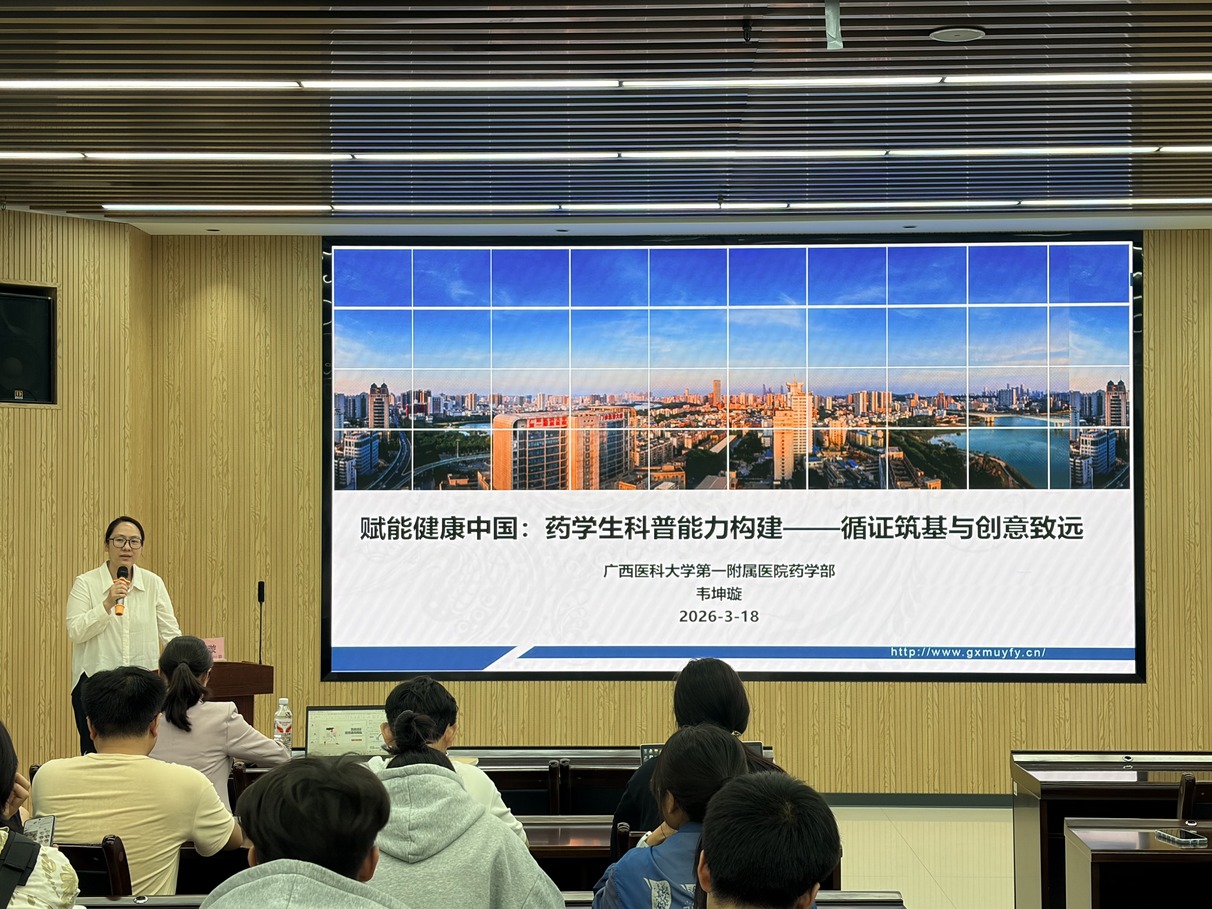 为普及合理用药知识,提升学生科普创作与健康传播能力,3月18日晚上,药学院特邀请学校第一附属医院药学部主任药师韦坤璇,在校本部药基楼1310多功能厅开展专题讲座,近300名学生线上线下参与,讲座由药学院团委书记施承主持。