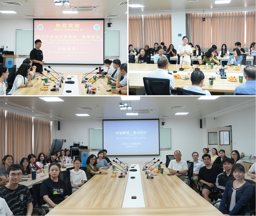 为浓厚学院学术氛围,提升师生科研能力与综合素养,基础医学院于3月下旬邀请澳门大学沈汉明教授、赵琦教授到访开展系列学术交流活动,学院院长罗彬主持相关活动。