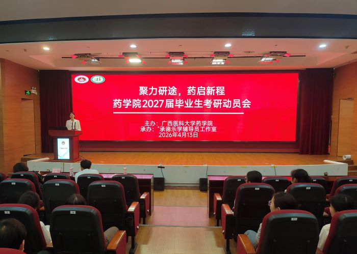 为鼓励学院2027届毕业生积极投身考研,提振备考热情与信心,解答备考过程中的各类疑惑,4月13日,药学院于科技楼报告厅召开2027届毕业生考研动员大会。药学院院长阳洁、党委副书记林晓、学工办主任谭斌出席会议,会议由林晓主持,辅导员刘乃钰,2027届全体毕业生共330余人参会。