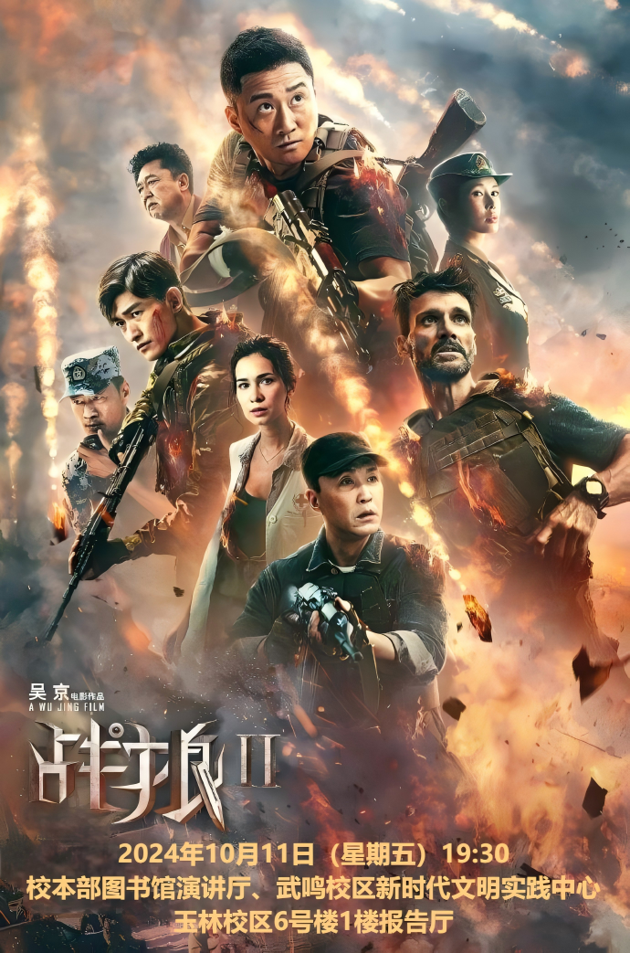 为进一步丰富师生校园文化生活,营造奋发向上的校园氛围,由学校党委宣传部牵头举办的“周末电影大家看”观影活动持续开展。本周观影活动将于2024年10月11日(星期五)晚上19:30在校本部图书馆演讲厅、武鸣校区新时代文明实践中心和玉林校区6号楼1楼报告厅放映影片《战狼2》,欢迎各位师生前来观看。