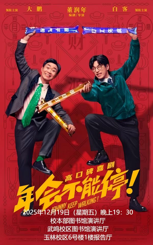 为进一步丰富师生校园文化生活,营造团结、和谐的校园氛围,由学校党委宣传部牵头举办的“周末电影大家看”观影活动持续开展。本周观影活动将于2025年12月19日(星期五)晚上19:30在校本部图书馆演讲厅、武鸣校区合一报告厅(图书馆地面一层报告厅)、玉林校区6号楼1楼报告厅同步放映影片《年会不能停》,欢迎广大师生前来观看。