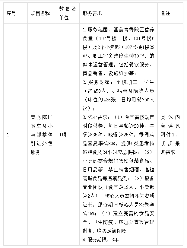 医院拟对青秀院区食堂及小卖部整体引进外包服务采购开展市场调研,现将本次调研事项公告如下: